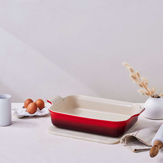 Die Auflaufformen von Le Creuset sind nicht nur funktional, sondern auch ein stilvoller Blickfang. Die strahlenden Farben, wie klassisches Ofenrot oder warmes Kirschrot, setzen geschmackvolle Akzente in Deiner Küche oder Deinem Esszimmer. Die Farben bleiben auch nach häufiger Nutzung strahlend und intensiv, und die Form lässt sich wunderbar in jede Kücheneinrichtung integrieren.