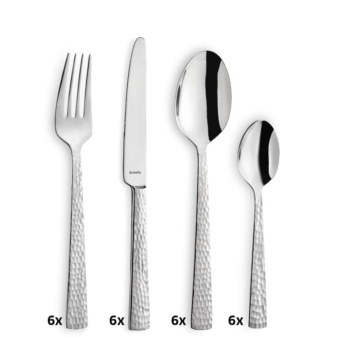 - Inhalt: 6 Kaffeelöffel, 6 Menügabeln, 6 Menülöffel, 6 Menümesser