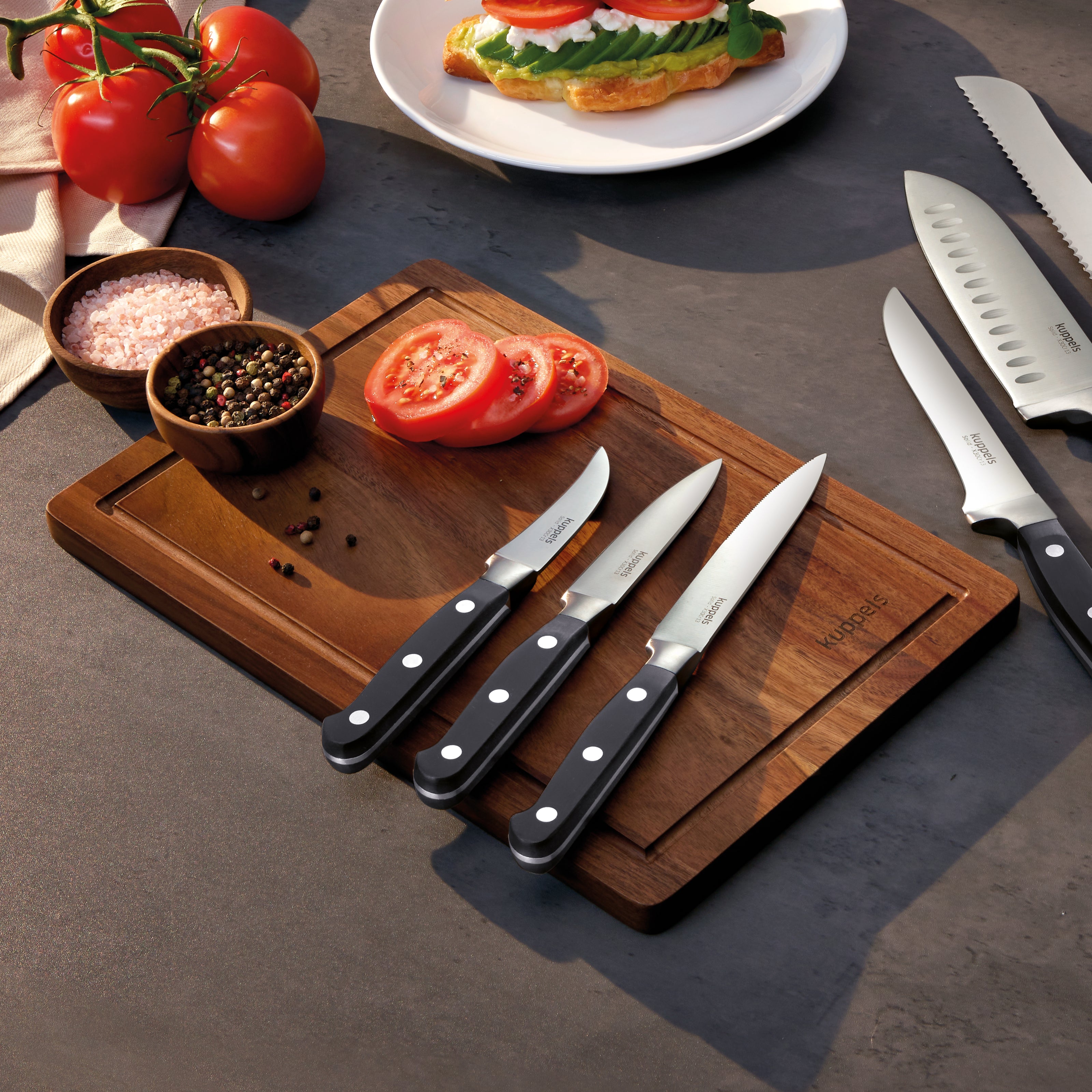 To keep your knives sharp for a long time, we recommend cutting on a suitable cutting board. Most of our kitchen boards are made of bamboo. This protects your knife blades, allowing you to enjoy cutting for longer.