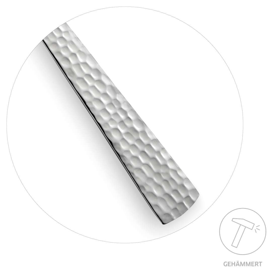 The extravagant look of the Felicity cake forks is a contemporary eye-catcher on any table setting – the unusual, rustic hammered design is solid and durable, creating a sophisticated table setting. The craftsmanship of the cutlery pieces is particularly high, and the embossed hammered decor makes them a true style icon, as distinctive as they are eye-catching. The hammered pattern emphasizes the simple contours of the design and adds a special shine to the table. Surprise your guests with the unique "Felicity" cake forks.