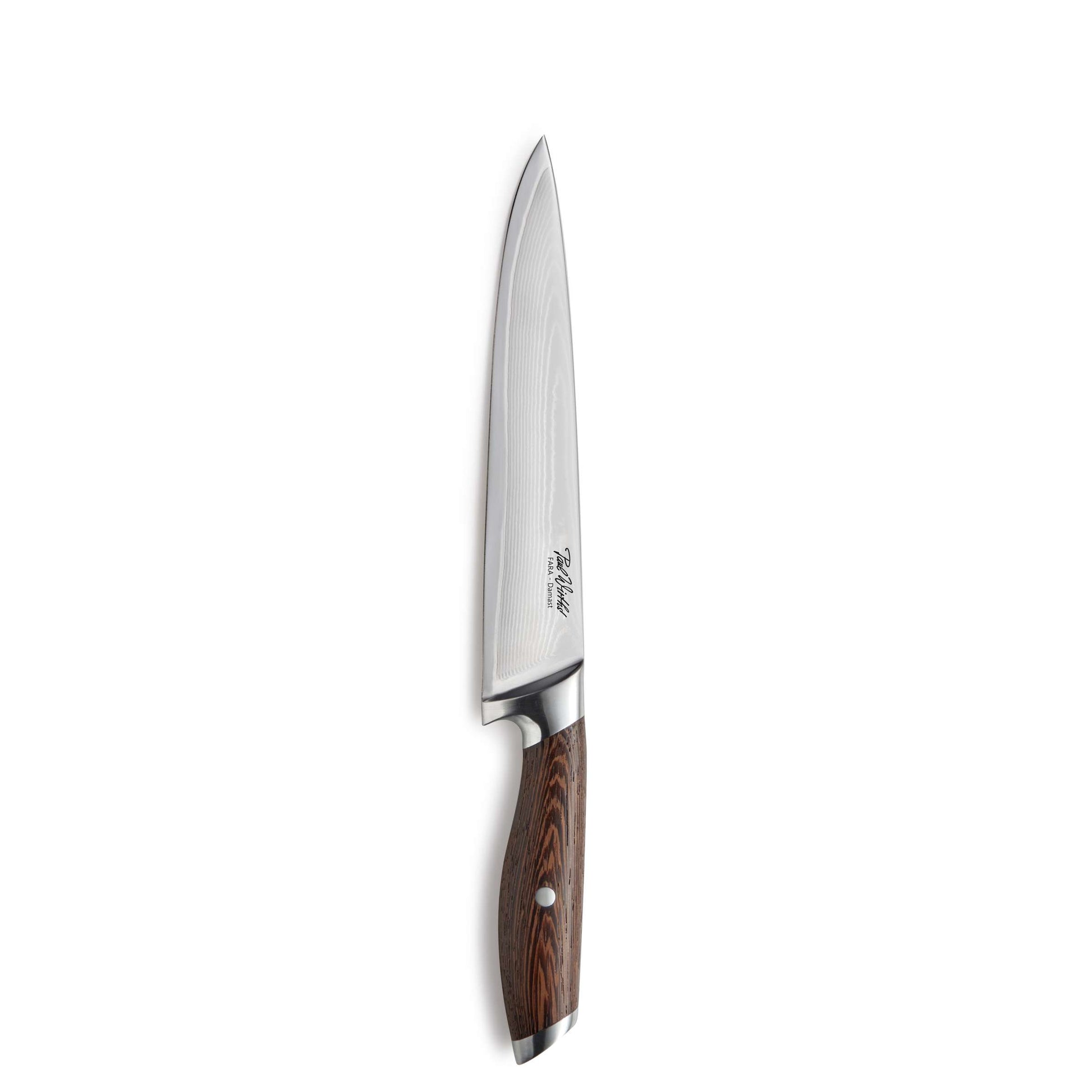 The Fara Damascus steel carving knife guarantees the highest precision when cutting succulent roasts, tender fillets, or thin slices of beef steak. With its slim, sharp blade, the knife glides effortlessly through any type of meat. The blade's slender shape allows for delicate, controlled movements without tearing the meat or crushing the fibers. With a hardness of HRC 60 on the Rockwell scale, the edge stays sharp for an extremely long time – ideal for those who value professional results. The dark wenge wood handle lies comfortably in the hand and ensures a secure grip. The natural grain, a single rivet, and the discreetly incorporated Paul Wirths logo on the handle cap complete the design – elegant, functional, and high-quality.