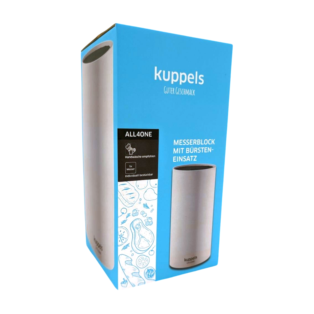 The ALL4ONE knife block with bristle insert from Kuppels combines design with practical functionality. The fine plastic bristles hold knives securely, protect the blade, and allow for flexible insertion and removal. Suitable for 6 knives.