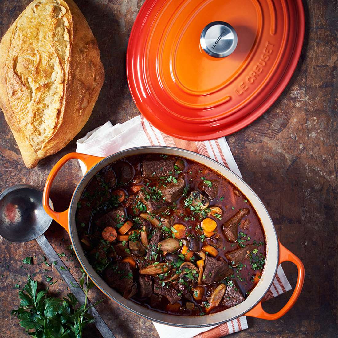 - Cast iron, enameled interior. Capacity: 4.7 liters.