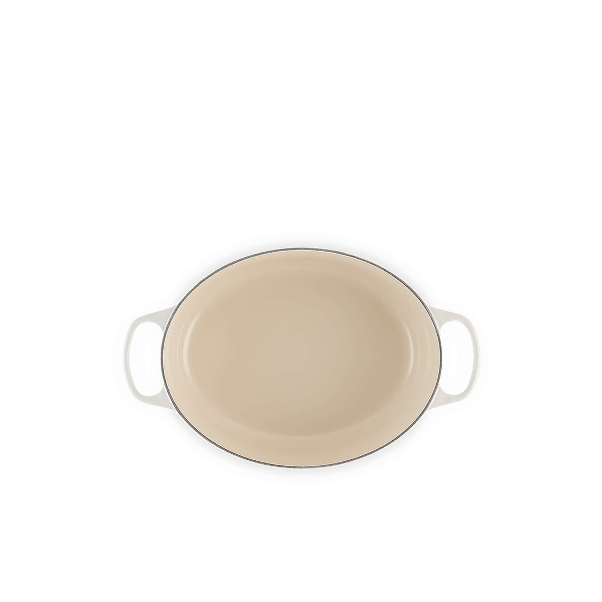 - Cast iron, enameled interior. Capacity: 6.3 liters.
