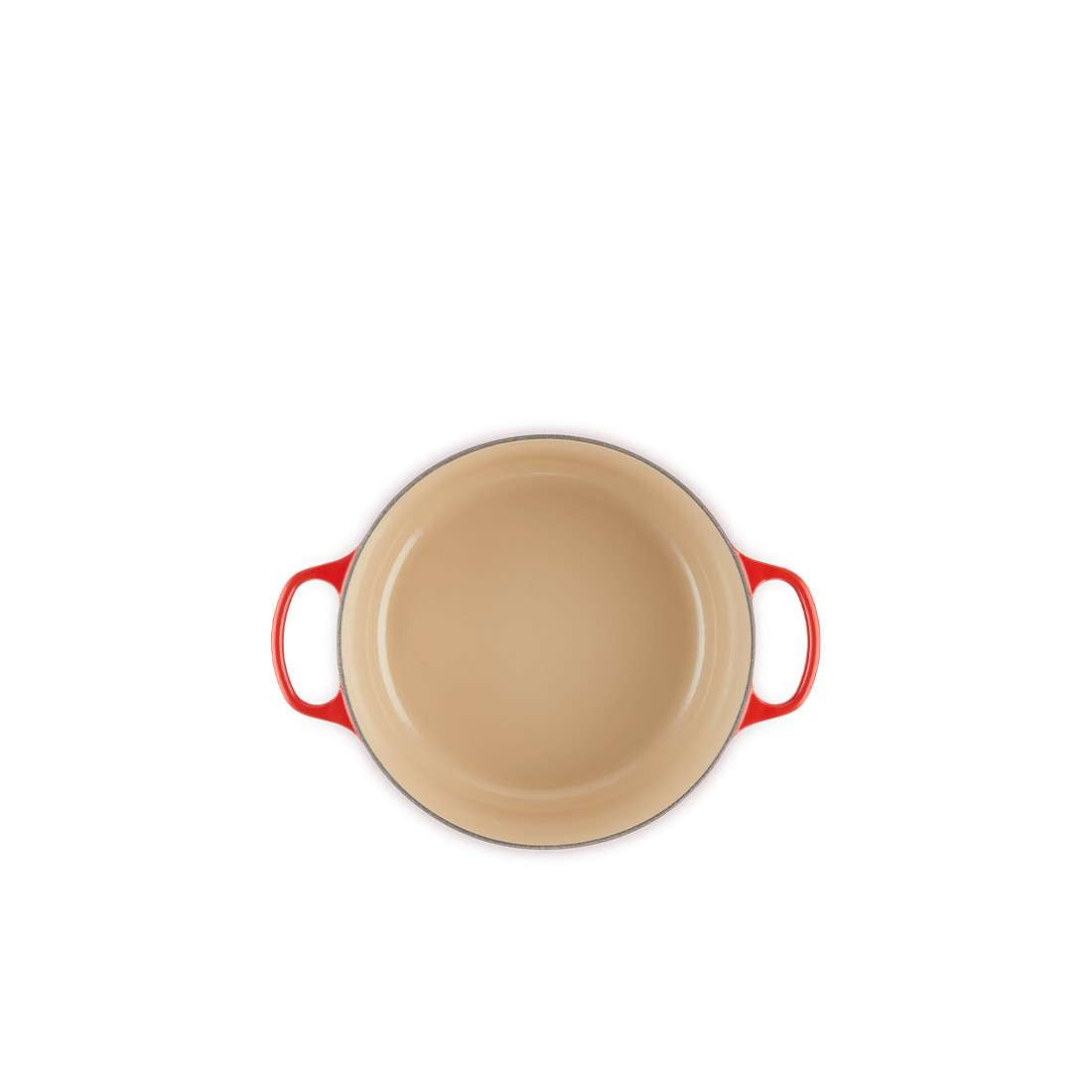 - Cast iron, enameled interior. Capacity: 6.7 liters.