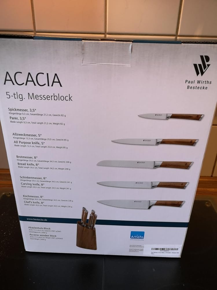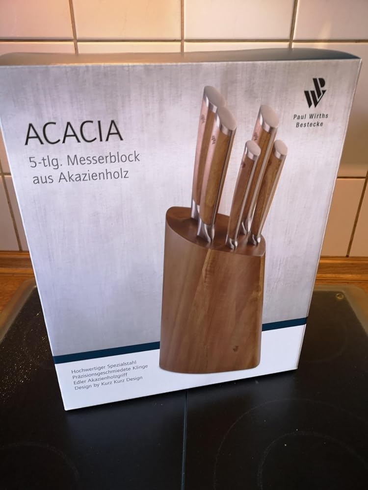 Das Acacia Messerset von Paul Wirths ist sehr gut verarbeitet u. mit dem modern eliptisch geformten Messerblock optisch sehr gelungen. Die Klingen sind scharf u. durchgehend bis zum Griffende, so dass die Messer etwas schwerer sind u. sehr gut ausbalanciert in der Hand liegen. Die Griffe aus Akazienholz sind fein geschliffen u. geölt; der massive Block aus Akazien Leimholz ebenso.Ich gebe 5*. Sollten Haltbarkeit u. Schärfe im Gebrauch den ersten Eindruck nicht wiederspiegeln, werde ich die Rezension entsprechend abändern.