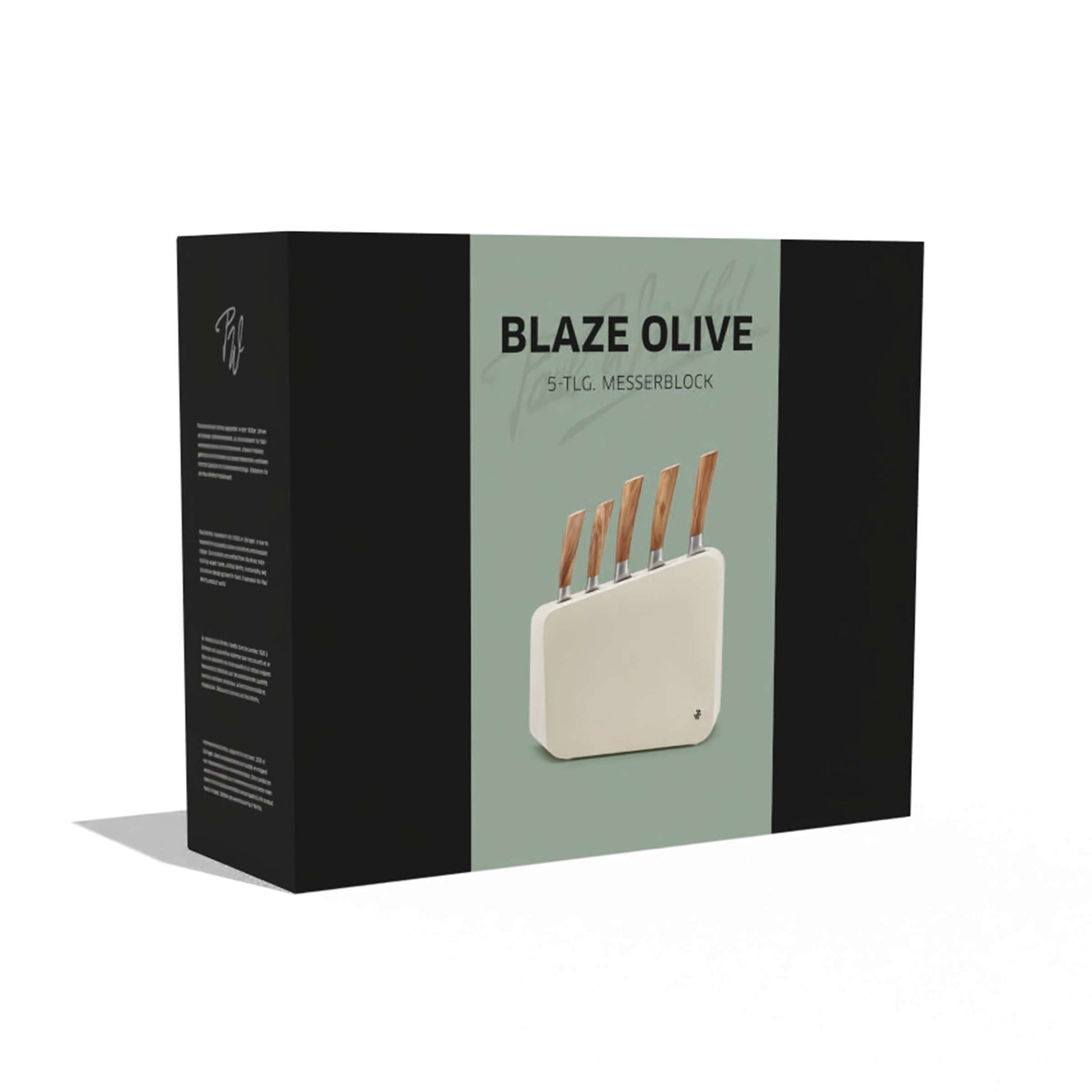 The Blaze knife block is the perfect combination of modern design and superior cutting performance. The block unites its clean, asymmetrical design with the outstanding quality of the Blaze knife series. Timeless design, the finest materials, and excellent craftsmanship converge here – an ensemble that brings style and precision to any kitchen. The exceptional quality of the blades ensures not only long-lasting sharpness but also impressive durability, convincing both professional and home cooks alike. Each knife in the Blaze series features a handle made of exquisite olive wood. This valuable hardwood is known for its resilience, natural color, and fine grain, which lends each knife a luxurious appearance. Beyond its elegant look, olive wood offers a superb feel, ensuring safe and comfortable use. Thanks to the precise alignment between blade and handle, each knife fits perfectly in the hand. The balanced design allows for fatigue-free cutting, making these knives the ideal companion for both everyday use and demanding culinary creations. The knife block itself impresses with its ivory finish, gently rounded corners, and modern, asymmetrical design. Together with the elegant Blaze knives, it creates a harmonious overall look that enhances any kitchen – functional, stylish, and with a touch of luxury.