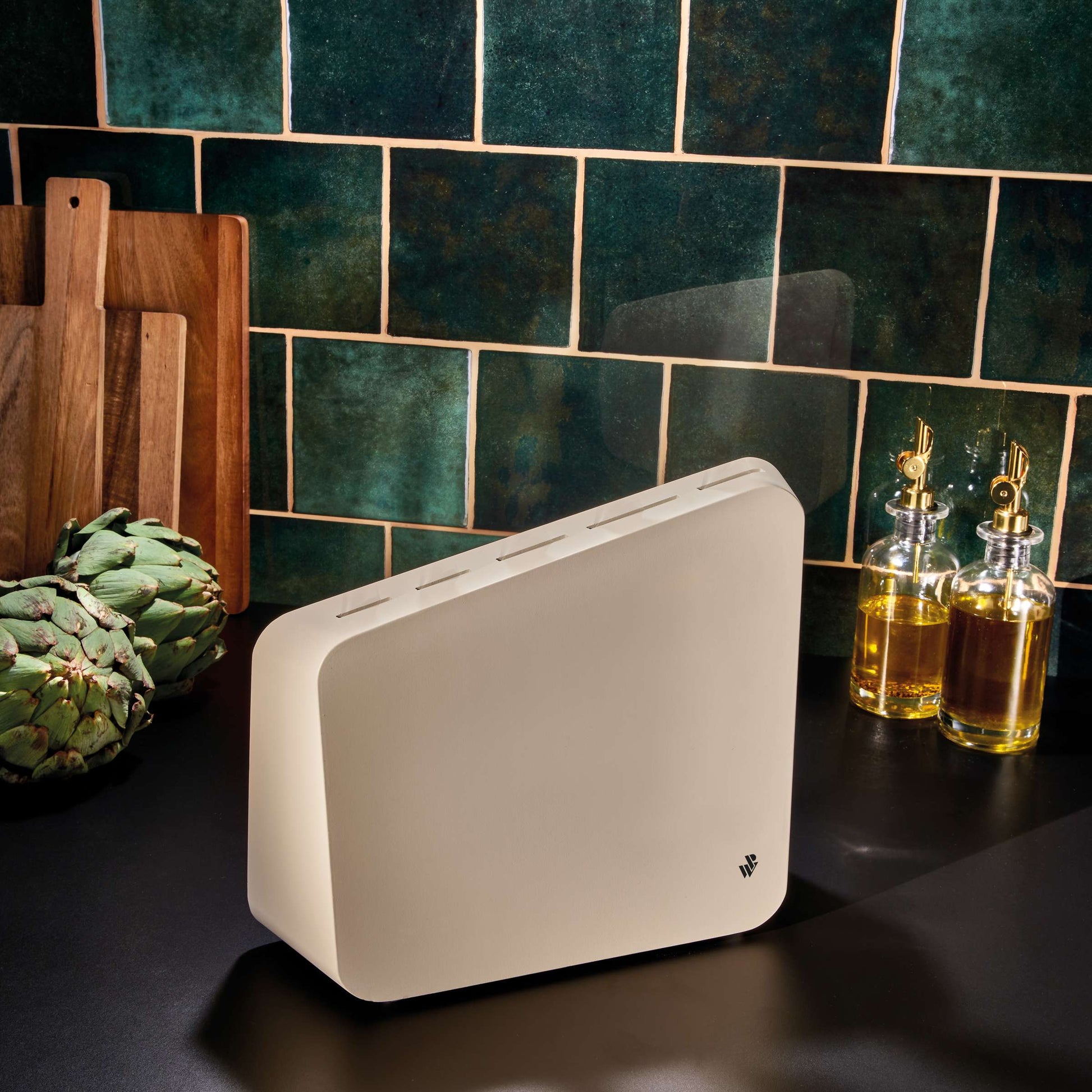 The Blaze knife block is the perfect combination of modern design and superior cutting performance. The block unites its clean, asymmetrical design with the outstanding quality of the Blaze knife series. Timeless design, the finest materials, and excellent craftsmanship converge here – an ensemble that brings style and precision to any kitchen. The exceptional quality of the blades ensures not only long-lasting sharpness but also impressive durability, convincing both professional and home cooks alike. Each knife in the Blaze series features a handle made of exquisite wenge wood. This valuable hardwood is known for its resilience, natural color, and fine grain, which lends each knife a luxurious appearance. Beyond its elegant look, wenge wood offers a superb feel, ensuring safe and comfortable use. Thanks to the precise alignment between blade and handle, each knife fits perfectly in the hand. The balanced design allows for fatigue-free cutting, making these knives the ideal companion for everyday use as well as demanding culinary moments. The knife block itself impresses with its ivory finish, gently rounded corners, and modern, asymmetrical design. Together with the elegant Blaze knives, it creates a harmonious overall look that enhances any kitchen – functional, stylish, and with a touch of luxury.