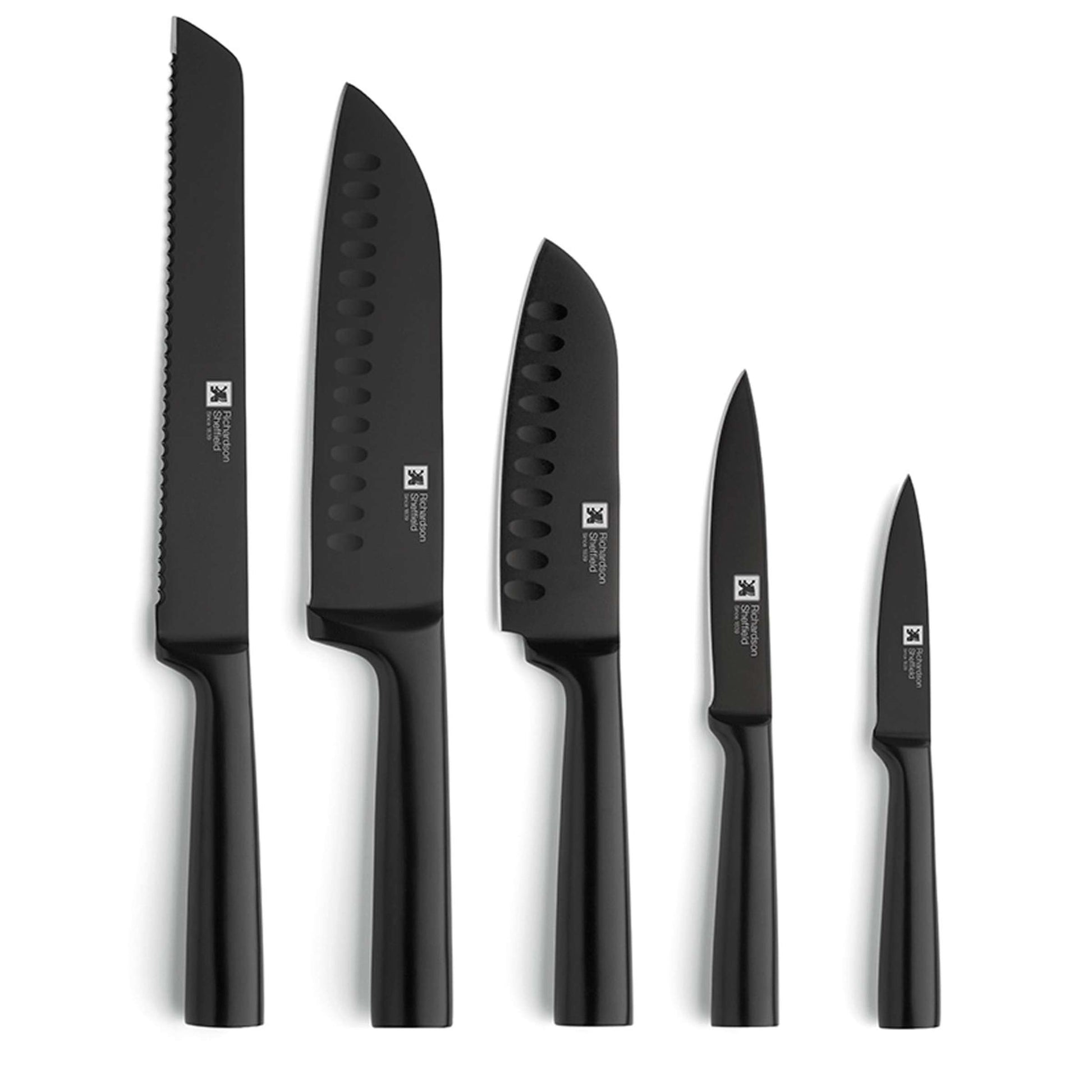 - 5-piece knife block: 1 paring knife, 1 all-purpose knife, 2 Santoku knives, 1 bread knife