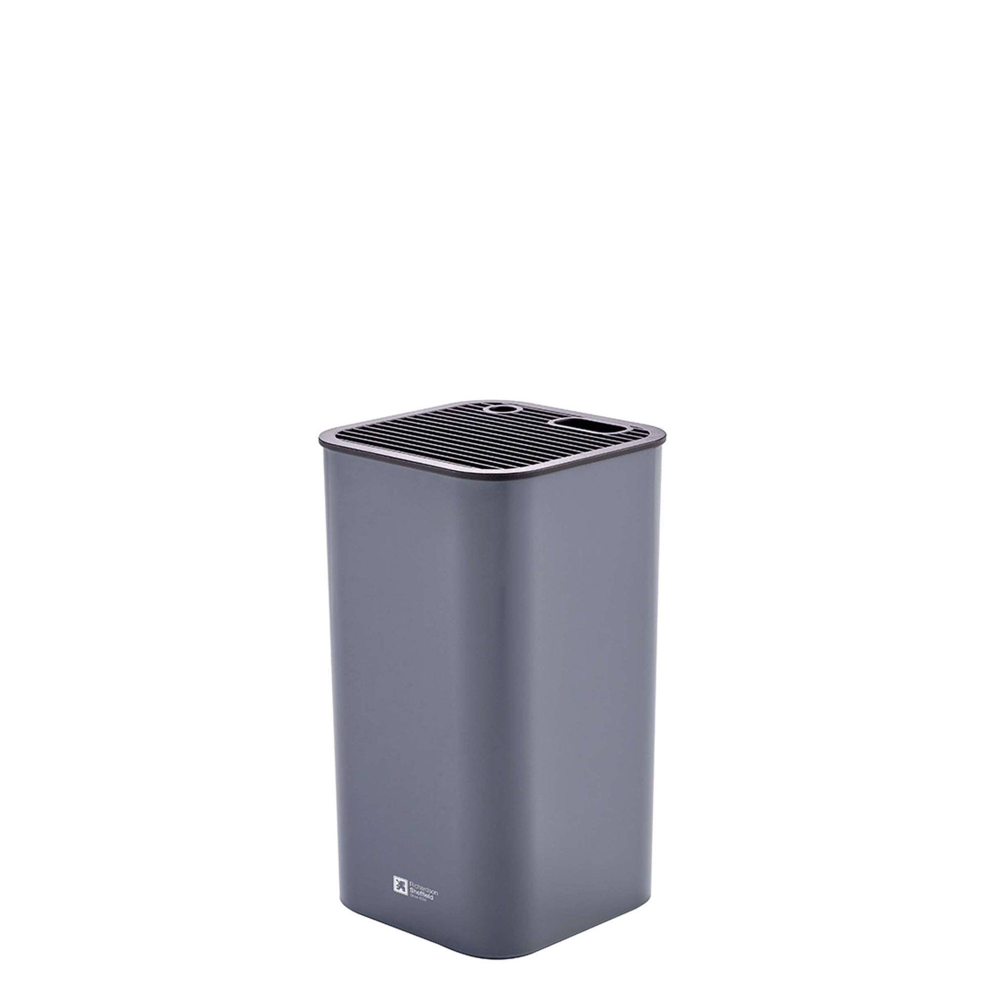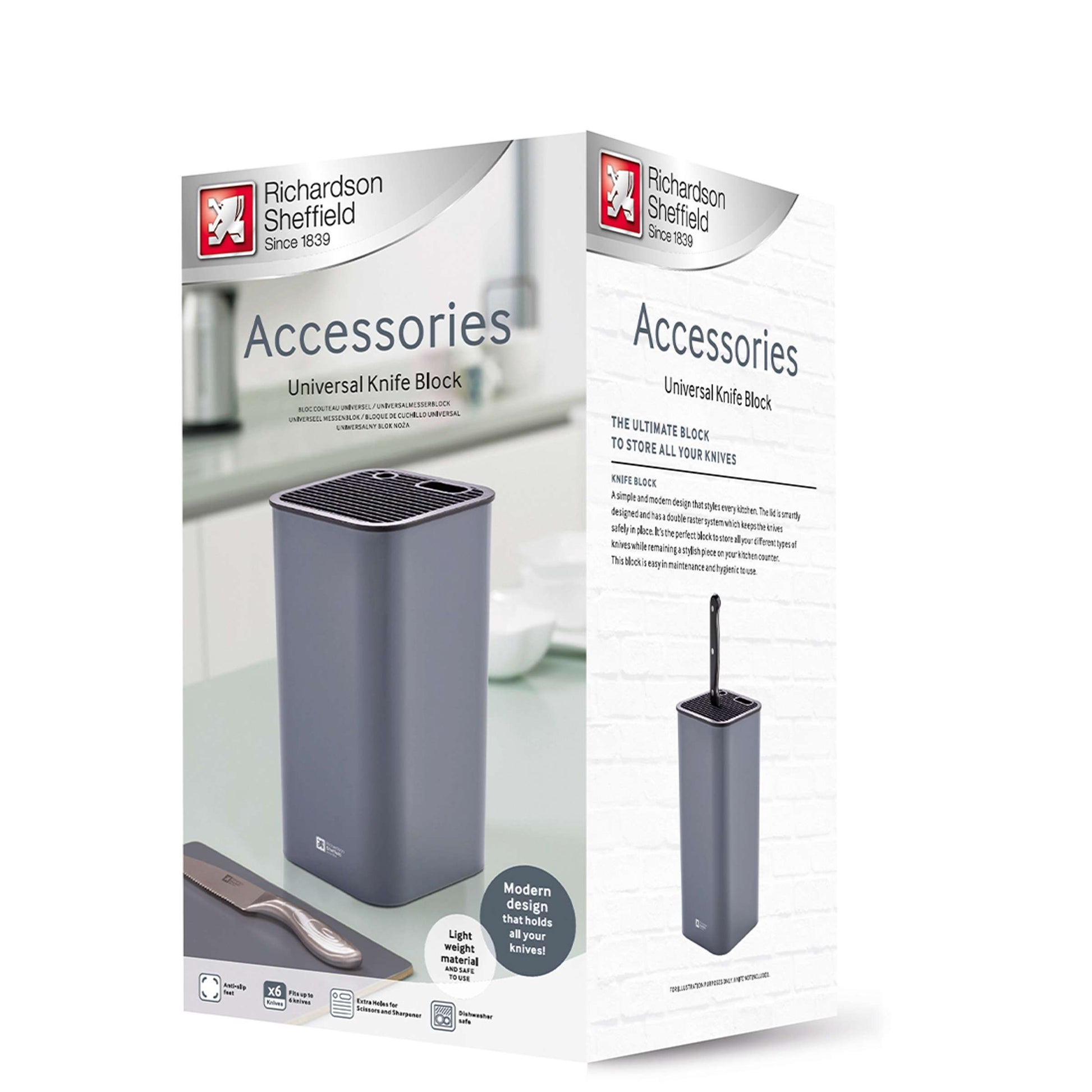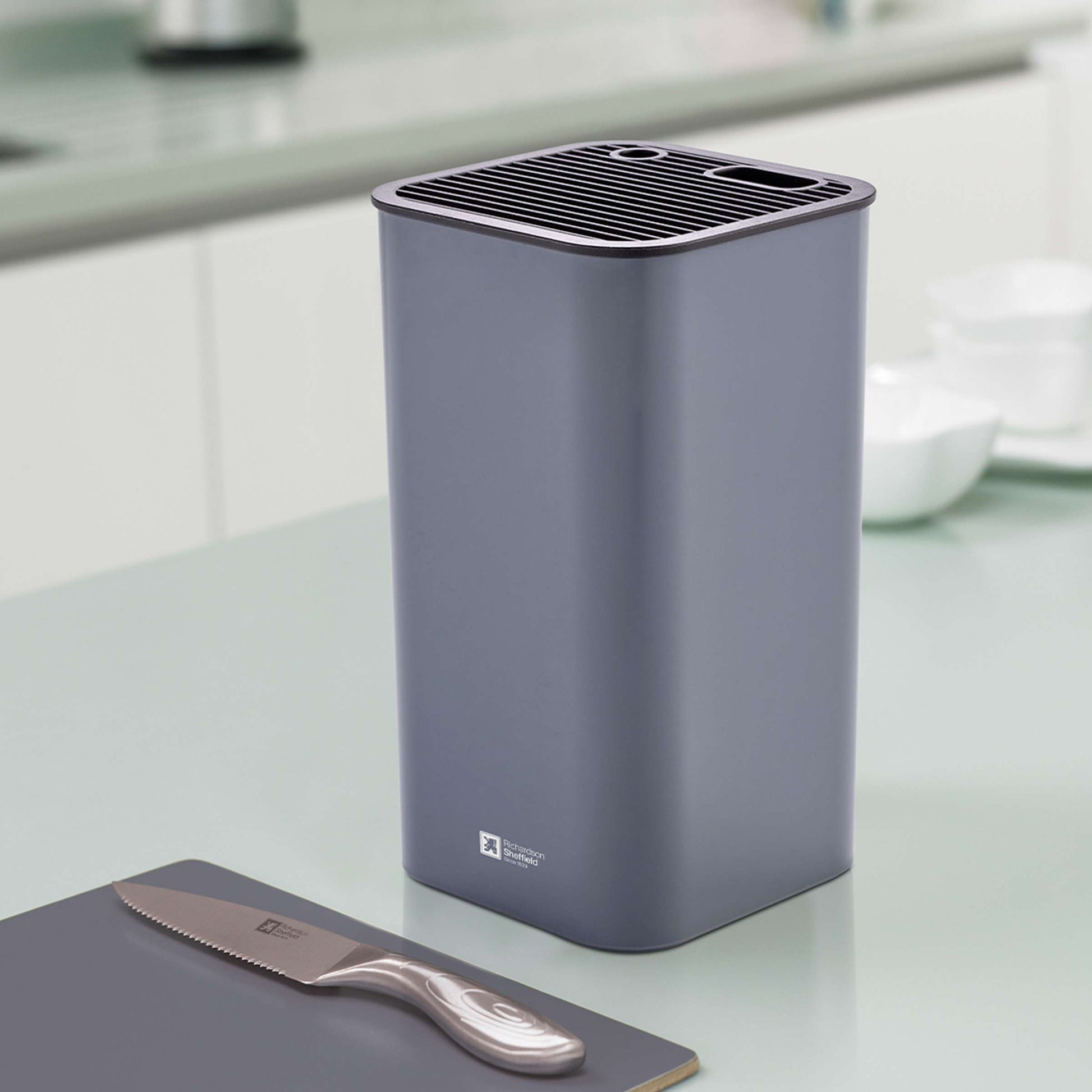 The space-saving, sleek design in modern gray makes this knife block from Richardson Sheffield the ideal knife storage solution for the modern kitchen. The block is made of robust plastic and features a grid for individually positioning each knife. It sits securely and non-slip on the countertop. Kitchen scissors and a knife sharpener can also be stored in the knife block, offering space for up to six knives. The lid is removable, and the entire knife block is dishwasher safe.