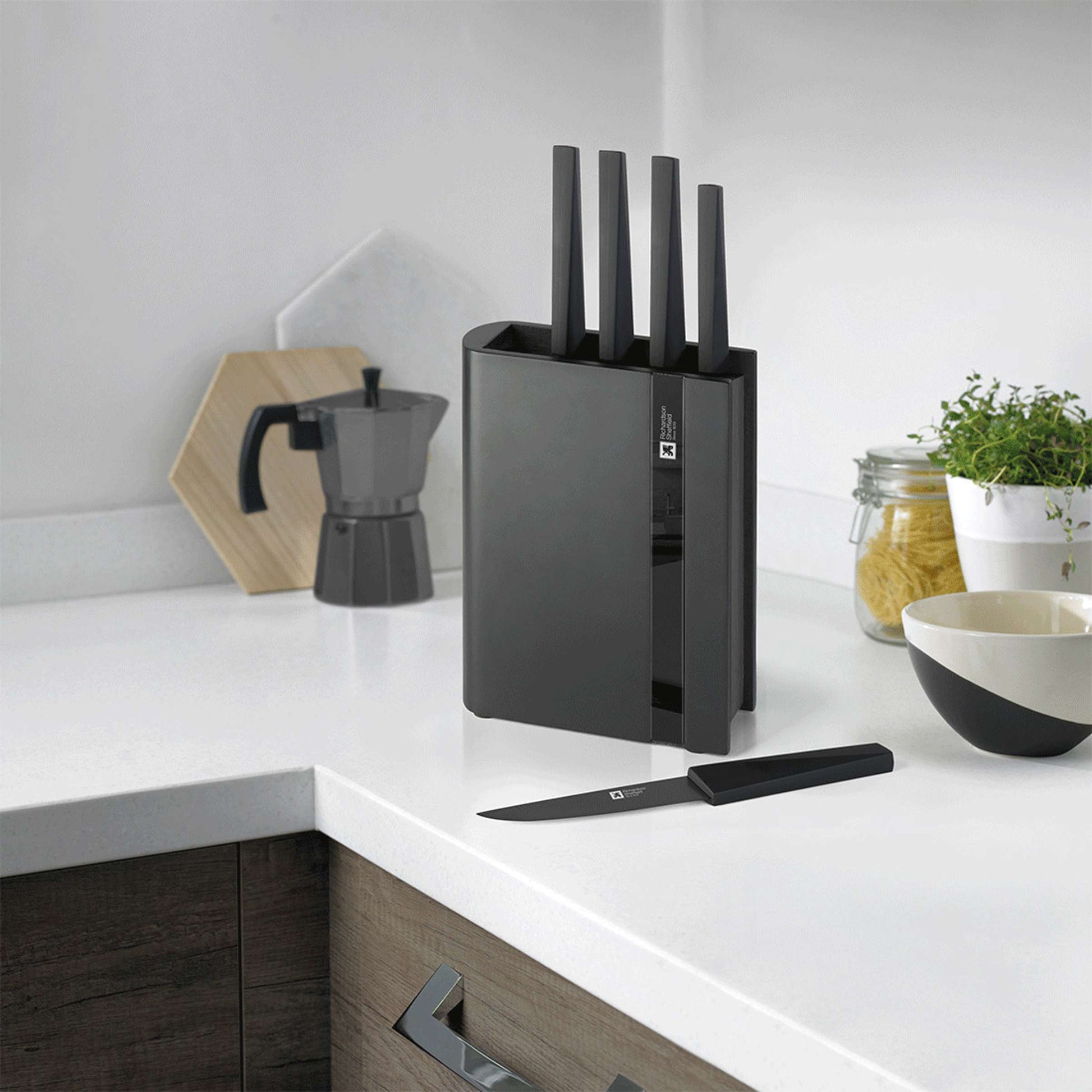 Make a statement in your kitchen with this stylish knife block from Richardson Sheffield. This 5-piece knife set combines modern design with premium functionality—perfect for those who value quality and aesthetics. The minimalist design, combined with the natural grain of the dark wood and subtle black elements, fits perfectly into modern kitchens and impresses with its durability and functionality. The sharp blades guarantee effortless cutting, while the matte black handles fit perfectly in the hand and ensure safe, precise work.