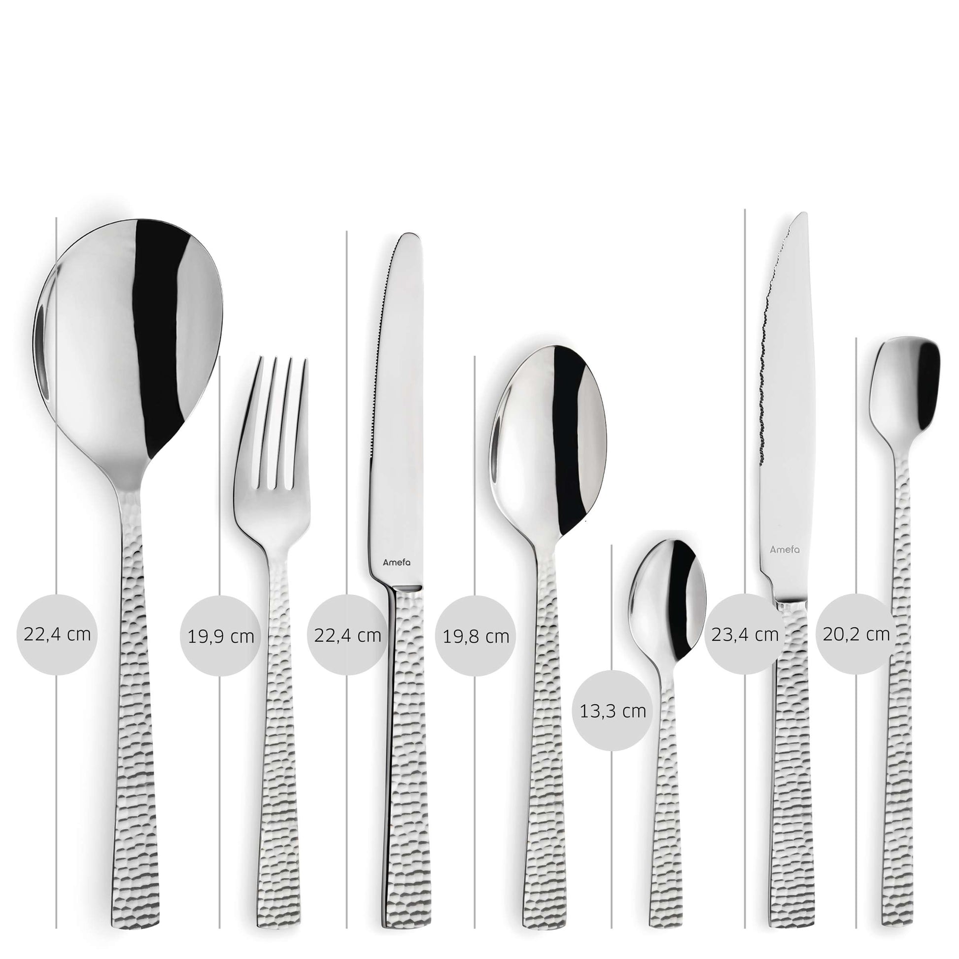 Der extravagante Look des Felicity Bestecksets ist ein zeitgenössischer Hingucker auf dem gedeckten Tisch – das außergewöhnliche, rustikale Hammerschlag-Design ist solide und beständig und sorgt für ein vornehmes Tischambiente. Die Verarbeitung des Bestecksets ist besonders hochwertig zudem liegt es besonders angenehm in der Hand. Sein eingeprägtes Hammerschlag-Dekor macht dieses hochglanzpolierte Edelstahlbesteck zu einer echten Stilikone und ebenso unverwechselbar wie auffällig. Das gehämmerte Muster betont die schlichte Kontur des Designs und bringt ein besonderen Glanz auf den Tisch. Überrasche deine Gäste mit dem etwas besonderen Besteck "Felicity".