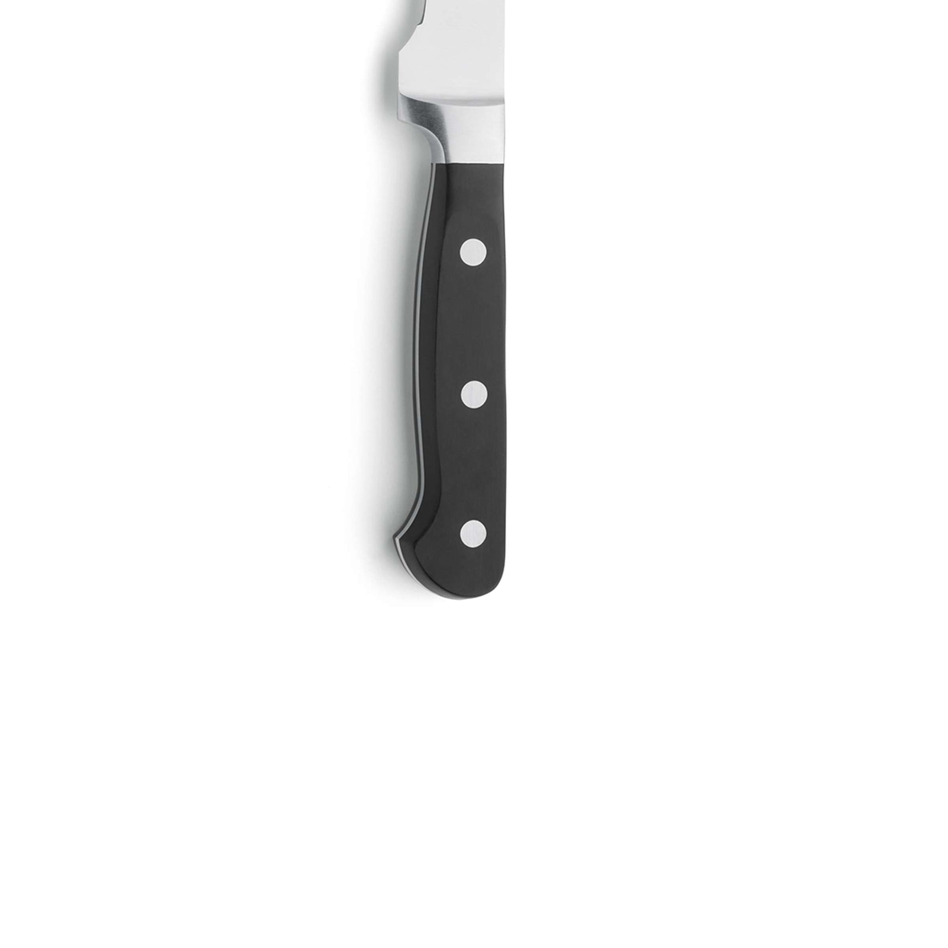 Amefa's Premium Schneidmesser schwarzer, klassischer Nietengriff trifft auf extrem scharfe Klinge aus 3Cr14 Klingenstahl. Für professionelle Schnitte und komfortables Schneiden.