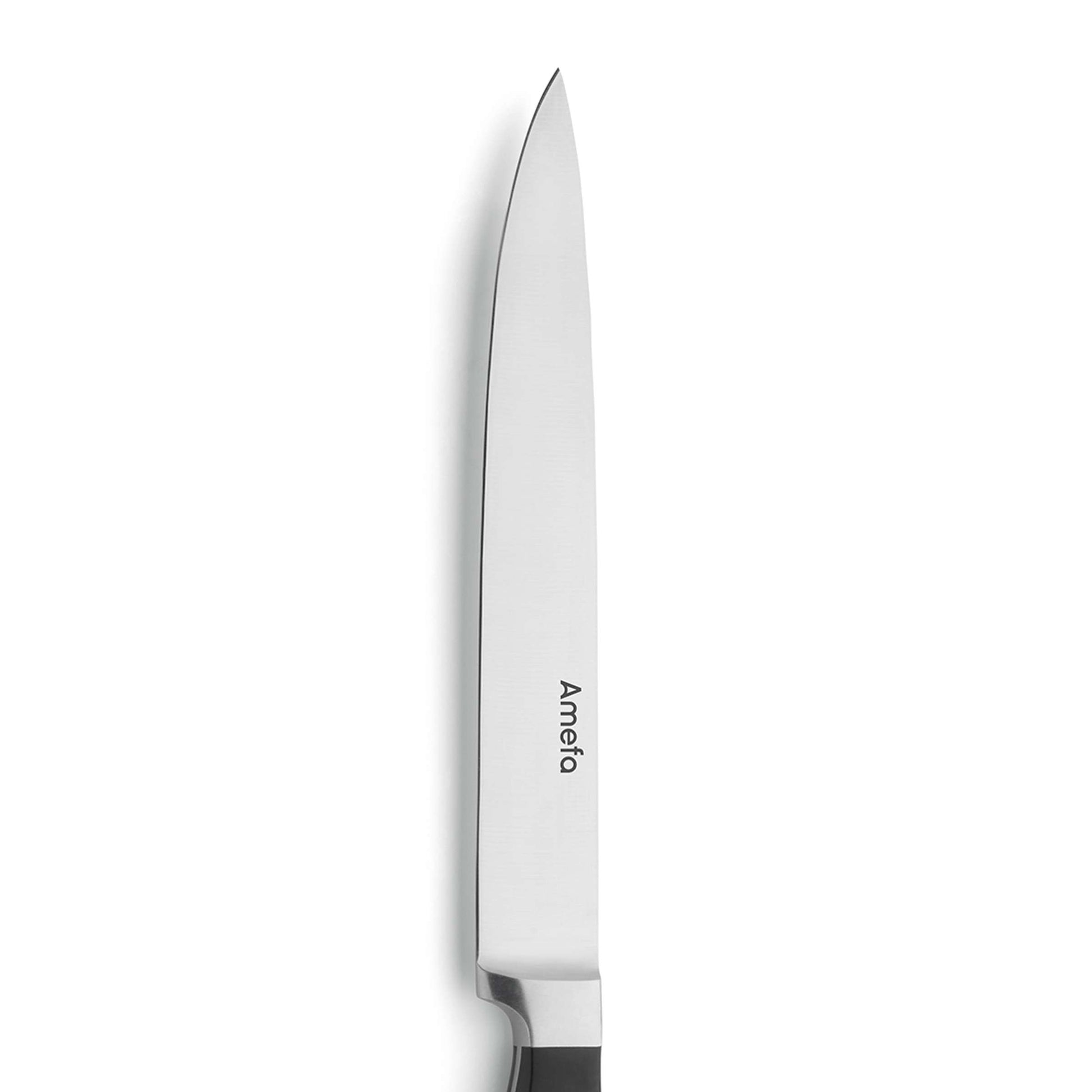 Amefa's Premium Schneidmesser schwarzer, klassischer Nietengriff trifft auf extrem scharfe Klinge aus 3Cr14 Klingenstahl. Für professionelle Schnitte und komfortables Schneiden.