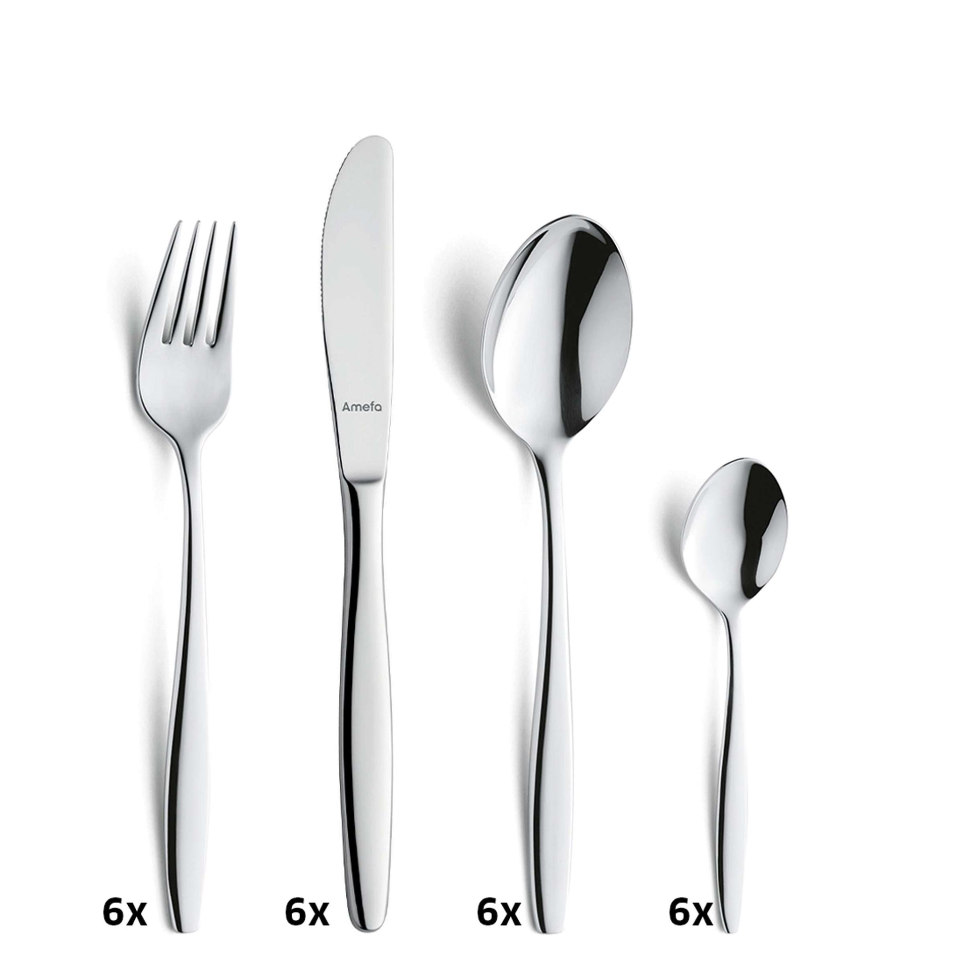 - Inhalt: 6 Kaffeelöffel, 6 Menügabeln, 6 Menülöffel, 6 Menümesser