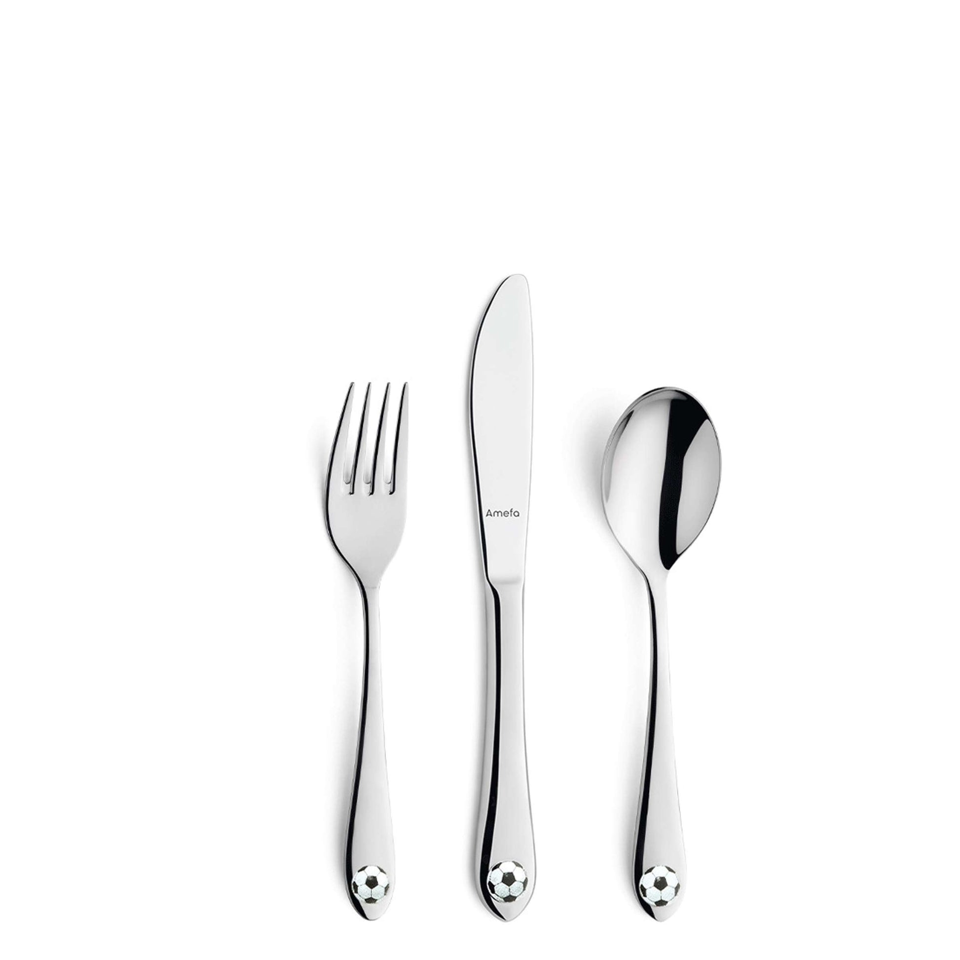 Ein Besteck für die jüngsten Familienmitglieder am Tisch: Das Qualitäts-Kinderbesteck lässt sich selbst von den ganz Kleinen sicher handhaben und ist mit den Fußballmotiven geschmückt. Ideal für kleine Fußallfans. Schlichtes, funktionales Kinderbesteck mit ergonomischen Griffen - ideal für kleine Kinderhände. Erleichtert das Lernen von Essen mit Messer, Gabel und Löffel. Abgerundete Formen für den sicheren Umgang zu Tisch.