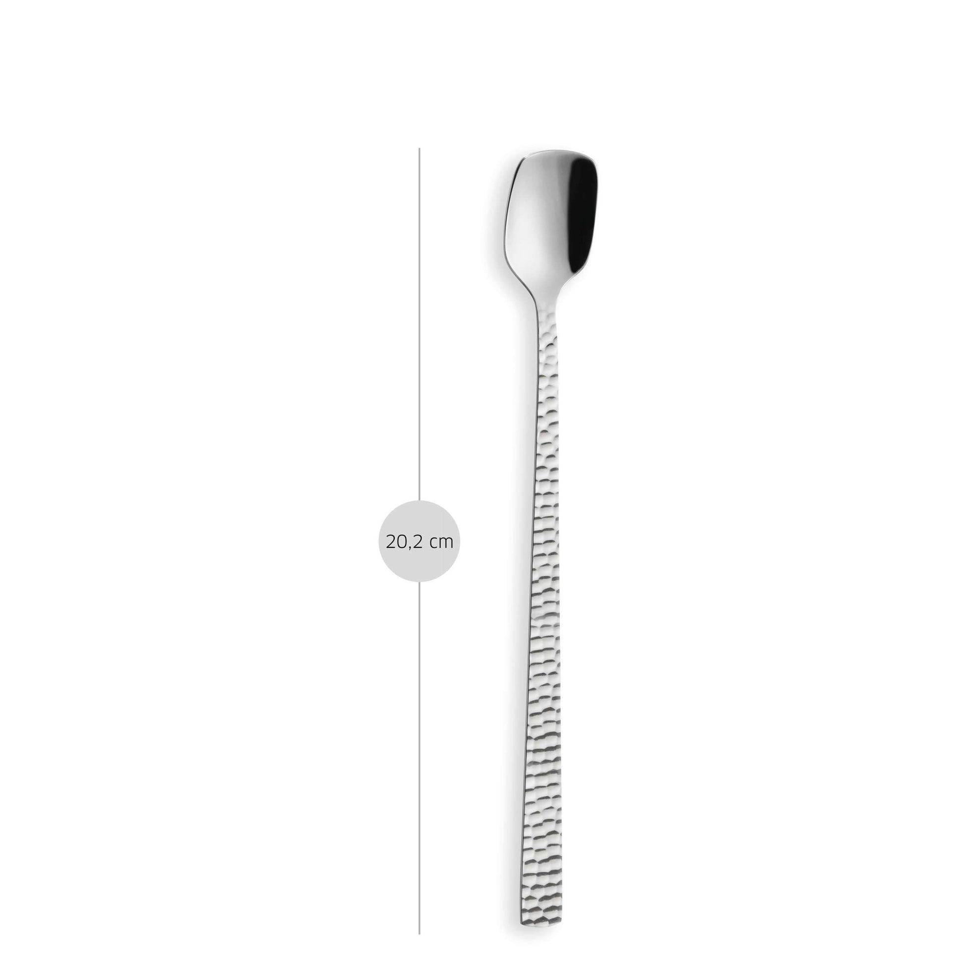 Der extravagante Look der Felicity Longdrink-Löffelset ist ein zeitgenössischer Hingucker auf dem gedeckten Tisch – das außergewöhnliche, rustikale Hammerschlag-Design ist solide und beständig und sorgt für ein vornehmes Tischambiente. Die Verarbeitung der Besteckeinzelteile ist besonders hochwertig, das geprägte Hammerschlag-Dekor macht es zu einer echten Stilikone und ebenso unverwechselbar wie auffällig. Das gehämmerte Muster betont die schlichte Kontur des Designs und bringt einen besonderen Glanz auf den Tisch. Überrasche deine Gäste mit dem etwas besonderen Latte Macchiato Löffel "Felicity".