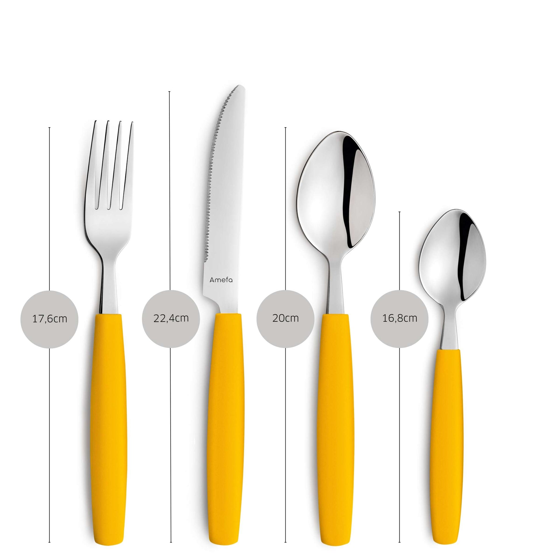 Mit dem Valoa Besteckset in Sommergelb zieht sonnige Frische auf Ihren Esstisch ein. Die farbigen Kunststoffgriffe strahlen in einem warmen Gelbton und machen das Besteck zu einem fröhlichen Begleiter für Frühstück, Mittagessen oder Abendbrot. Ideal für alle, die Farbe in den Alltag bringen möchten – ohne auf Funktionalität zu verzichten.Gefertigt aus rostfreiem Edelstahl und versehen mit robusten Kunststoffgriffen, bietet das Besteck eine einfache Handhabung und ist für die Spülmaschine geeignet. Besonders beliebt als Familienbesteck oder WG-Ausstattung bringt Valoa in Sommergelb gute Laune und Alltagstauglichkeit zusammen.