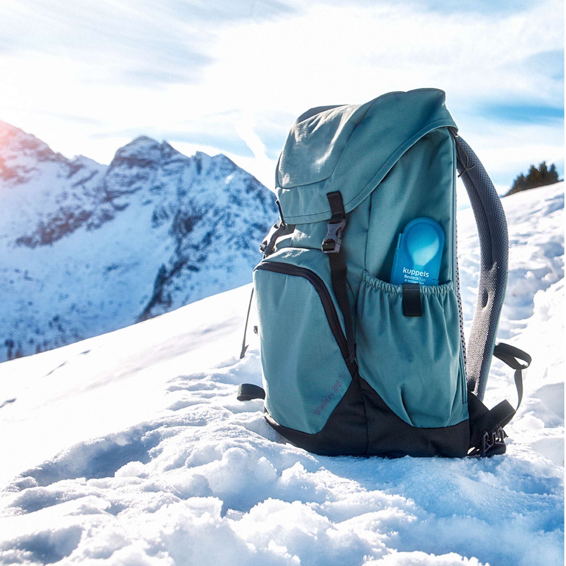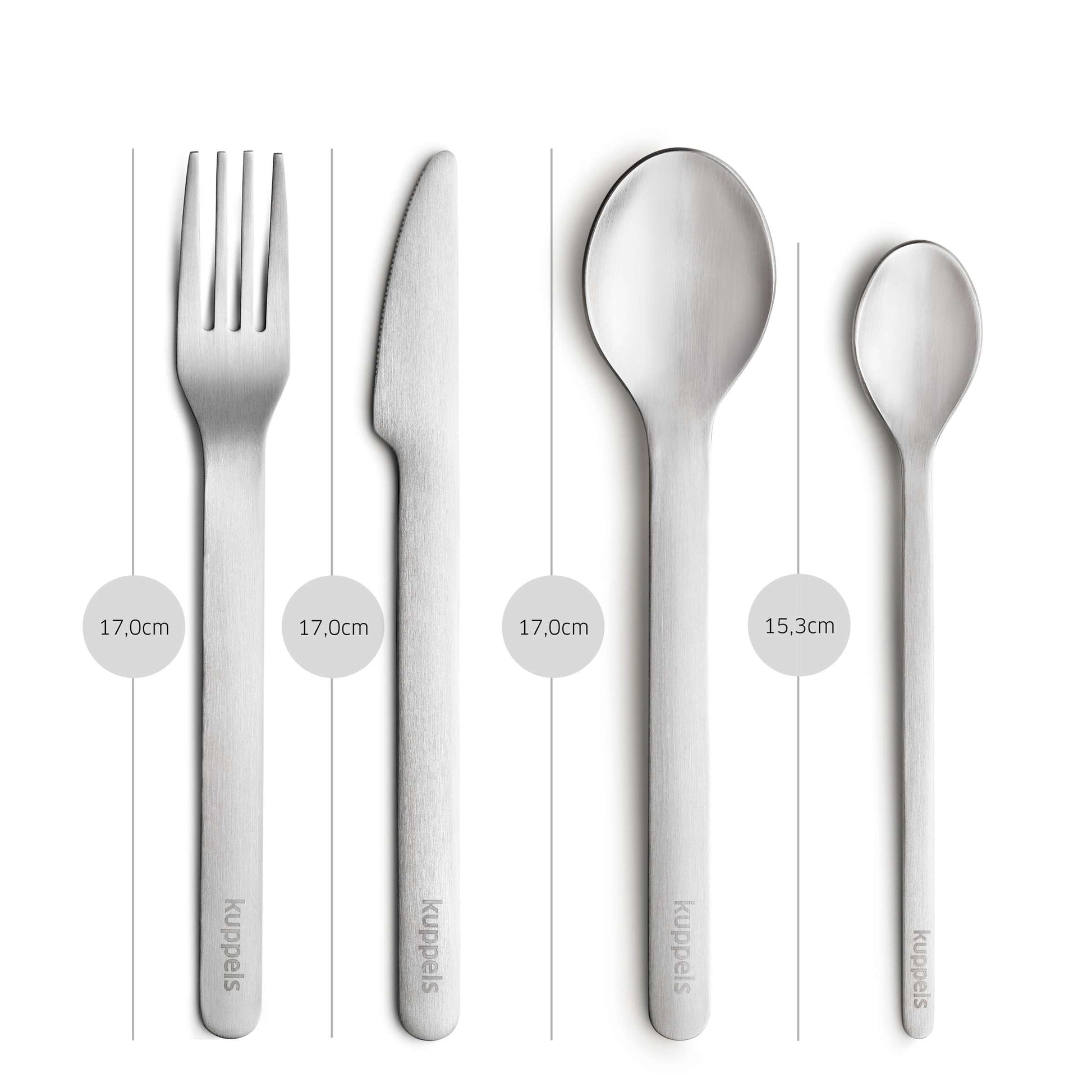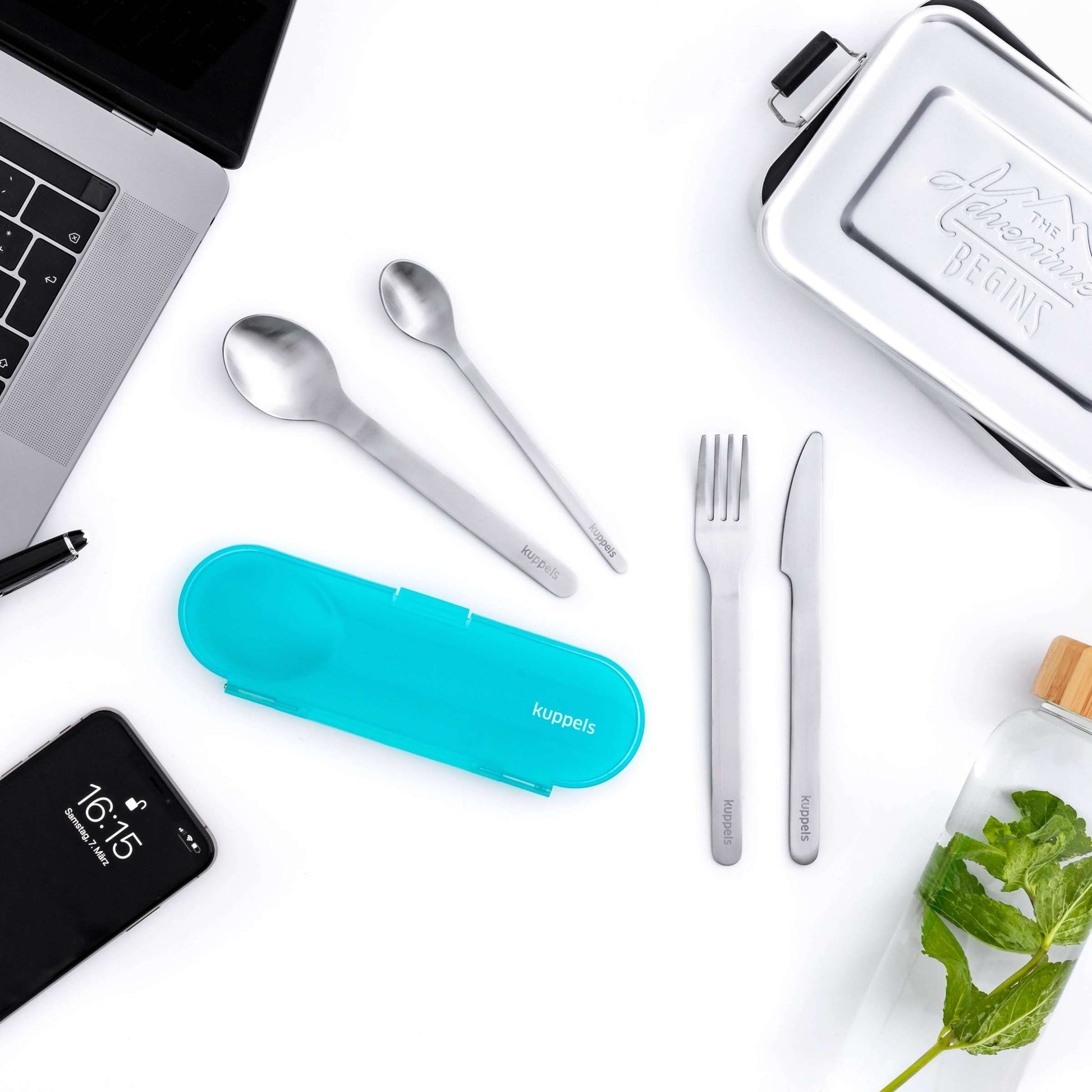 Mit dem Kuppels 2Go Besteck bist du unterwegs stets bestens versorgt. Genieße dein Porridge, Lunch oder Snack mit dem praktischen To-Go Besteckset - im Büro, im Zug, beim Picknick, in der Schule oder Uni. Besonders leicht, platzsparend und jederzeit griffbereit. Gabel, Messer, Eß- und Teelöffel lassen sich platzsparend ineinanderlegen und können in der verschließbaren Schutzhülle sicher und sauber transportiert werden. Perfekt für Kids, Teens und Erwachsene. Müll reduzieren - dank vielfach verwendbarem To-Go Besteck-Set. Natürlich spülmaschinengeeignet.