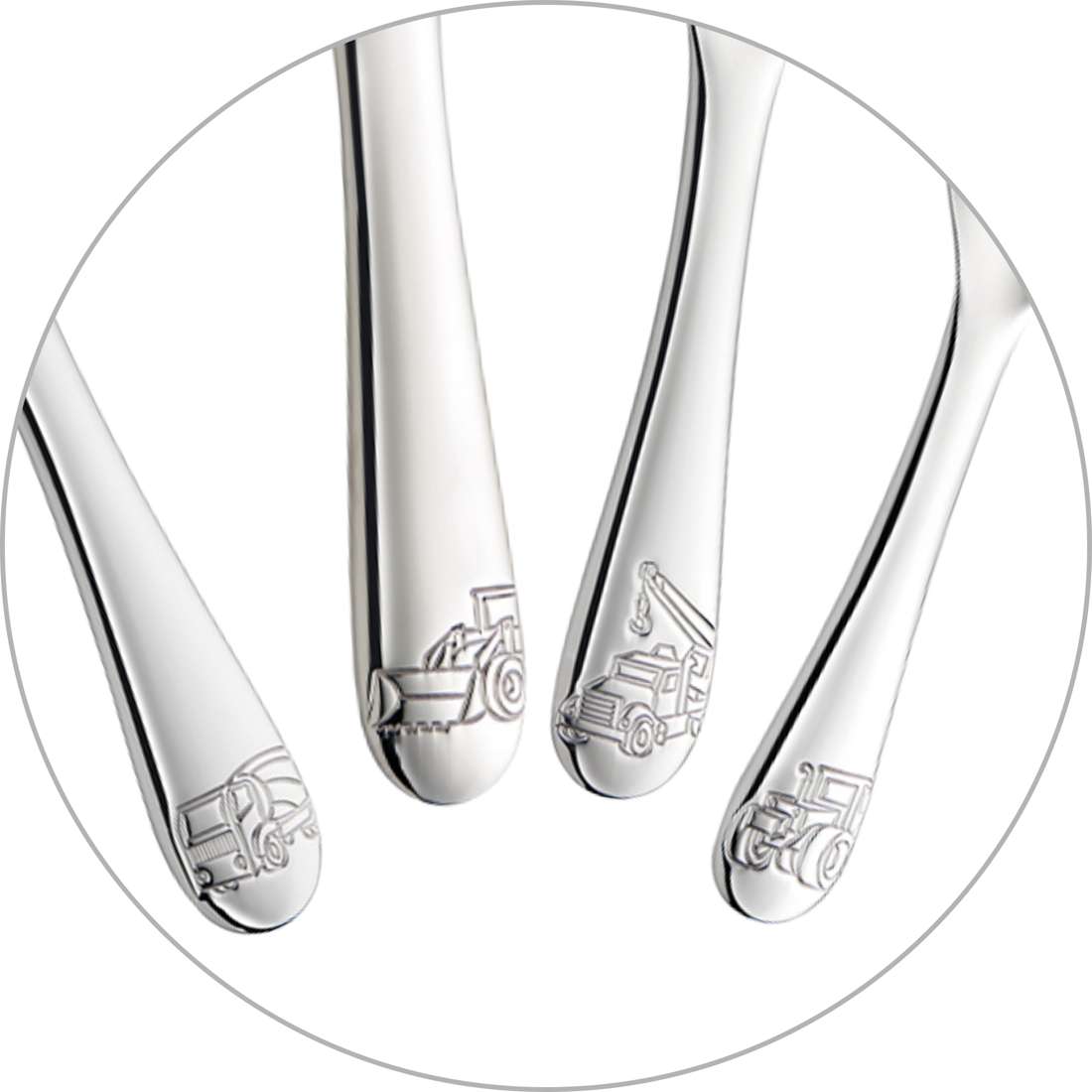 Das BAUSTELLENFAHRZEUGE Kinderbesteck Set 4-teilig mit niedlichen geprägten mit niedlichen geprägten Designs "Radlader, Betonmischer, Kran oder Traktor " sorgen für Freude bei den Mahlzeiten. Ideal für Kinderhände für einfaches und sicheres Speisen.