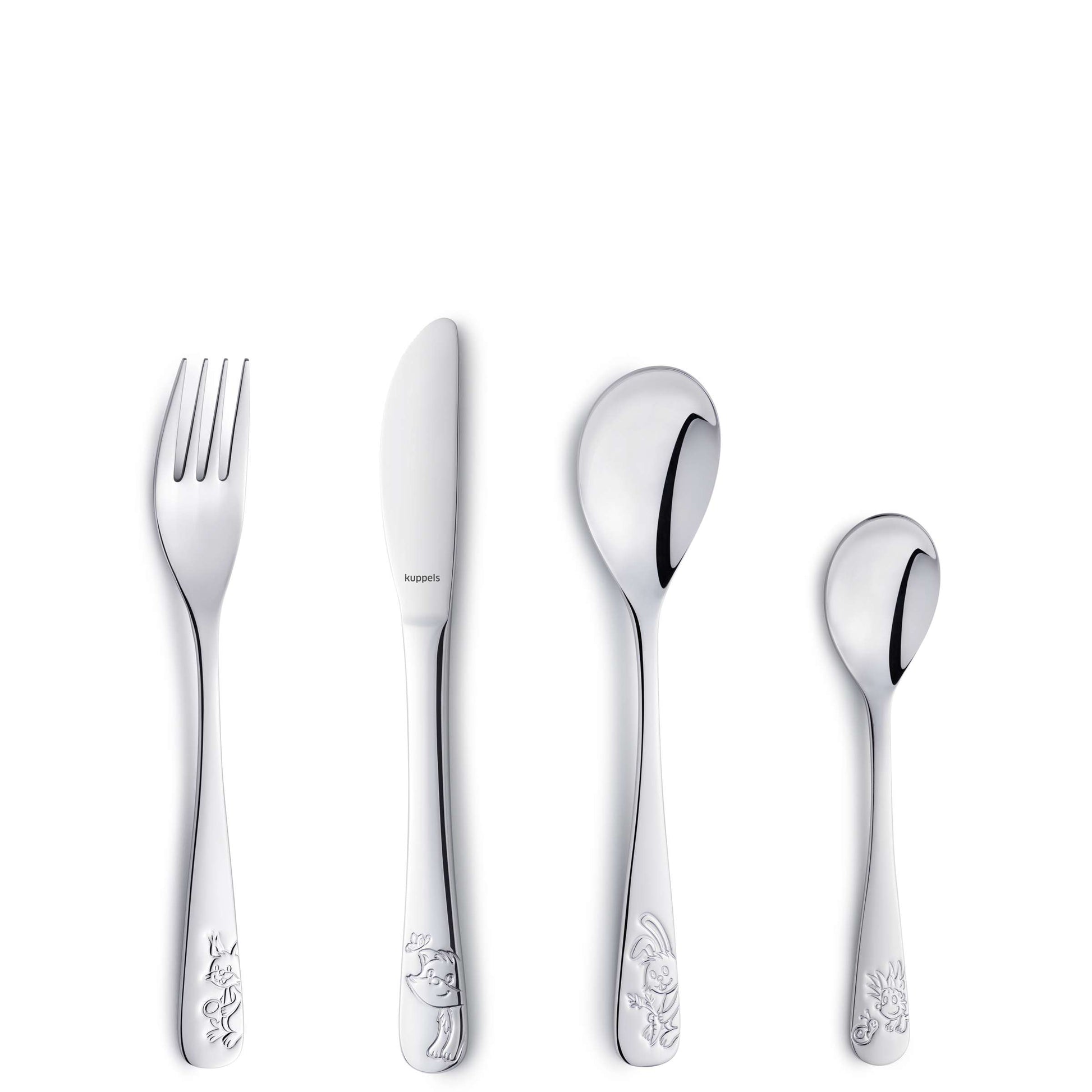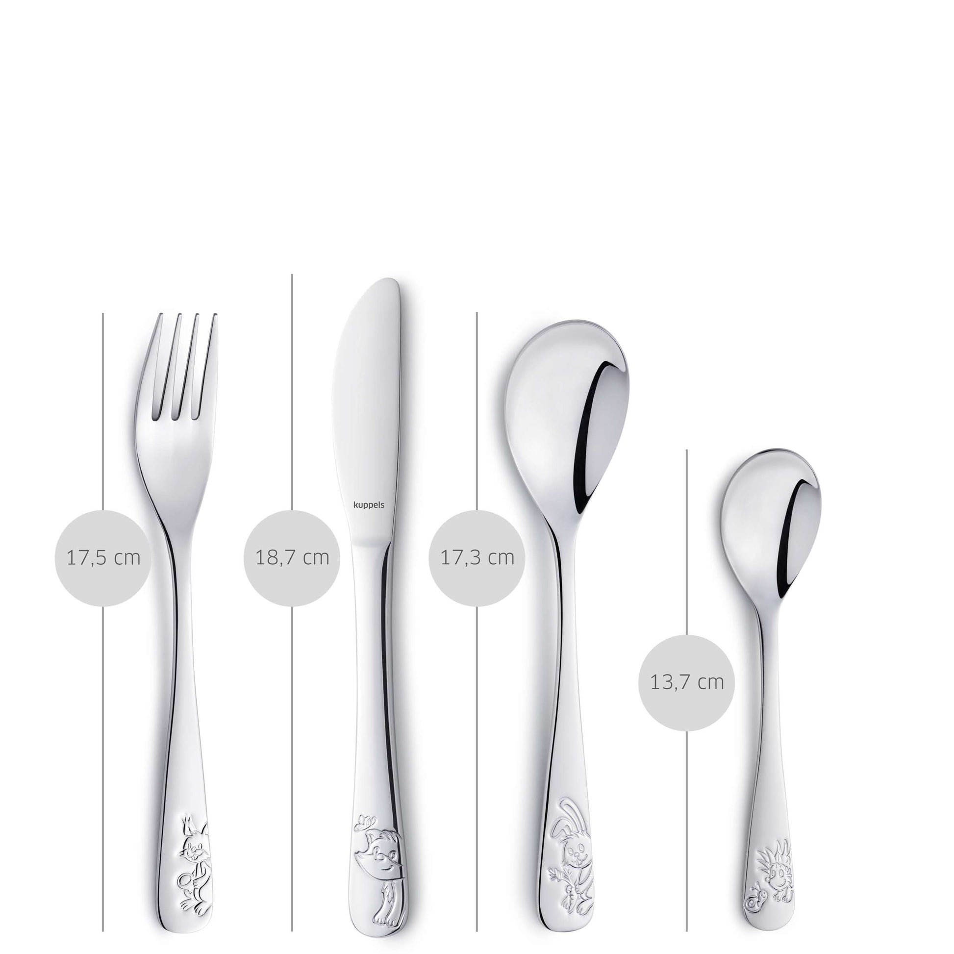 Inhalt: 1 Kindergabel, 1 Kinderlöffel, 1 Kindermesser, 1 Kinderteelöffel