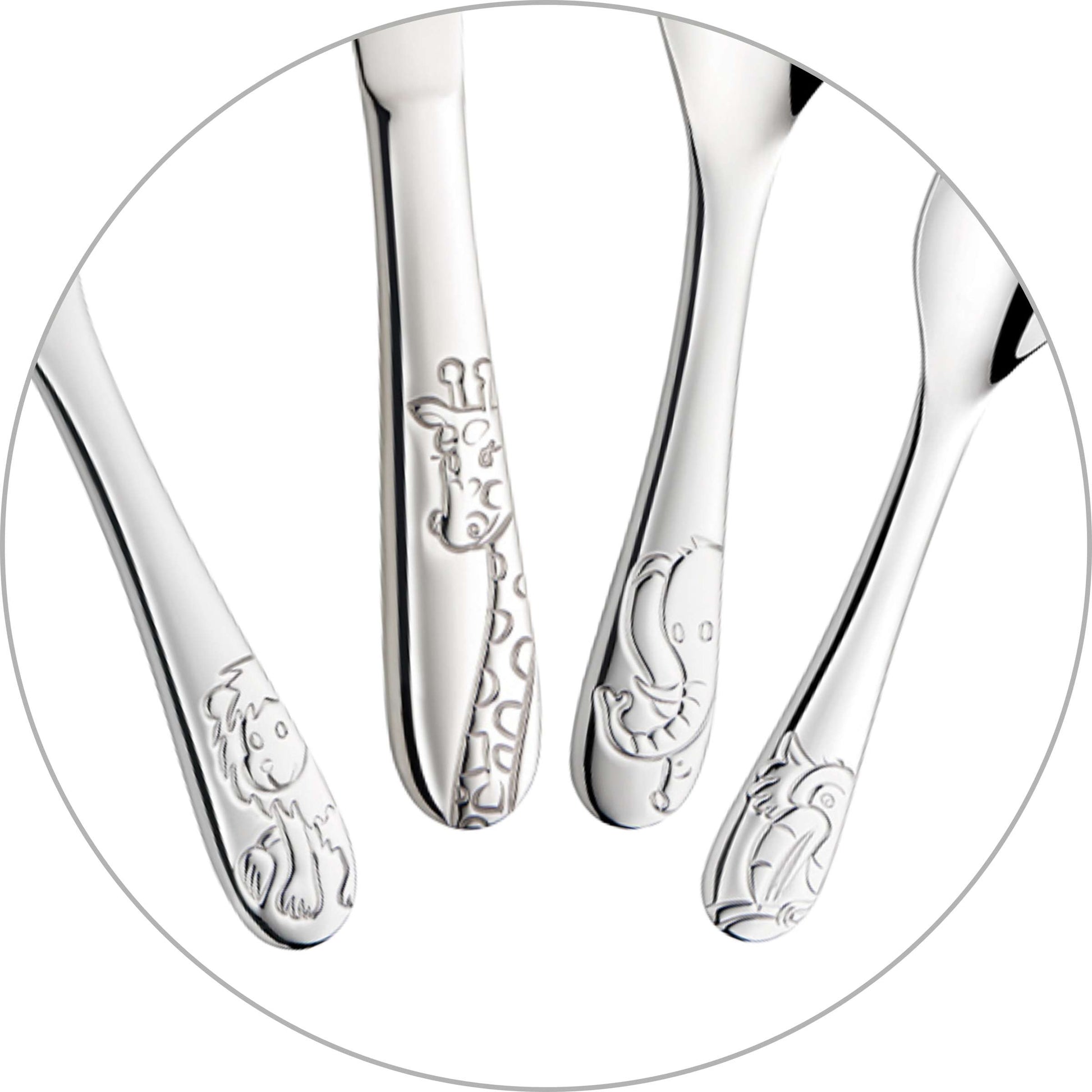 Das Kinderbesteck Dschungeltiere sind ein Muss für jeden kleinen Abenteuerer. Die geprägten Designs "Löwe, Elefant, Giraffe und Tukan" sorgen für besondere Freude am gedeckten Tisch. Perfekt für kleine Esser, die Zootiere oder Dschungeltiere lieben. Die einzelnen Besteckteile sind aus 18/10 Edelstahl gefertigt und haben sicher abgerundete Kanten, die das Speisen sicher und angenehm machen. Die Prägungen sind frei von jegliche Farbpartikeln - hier kann sich nichts lösen. Die perfekte Geschenkidee zu Geburtstag, Taufe oder Weihnachten. Natürlich spülmaschinenfest! Ab 3 Jahre.