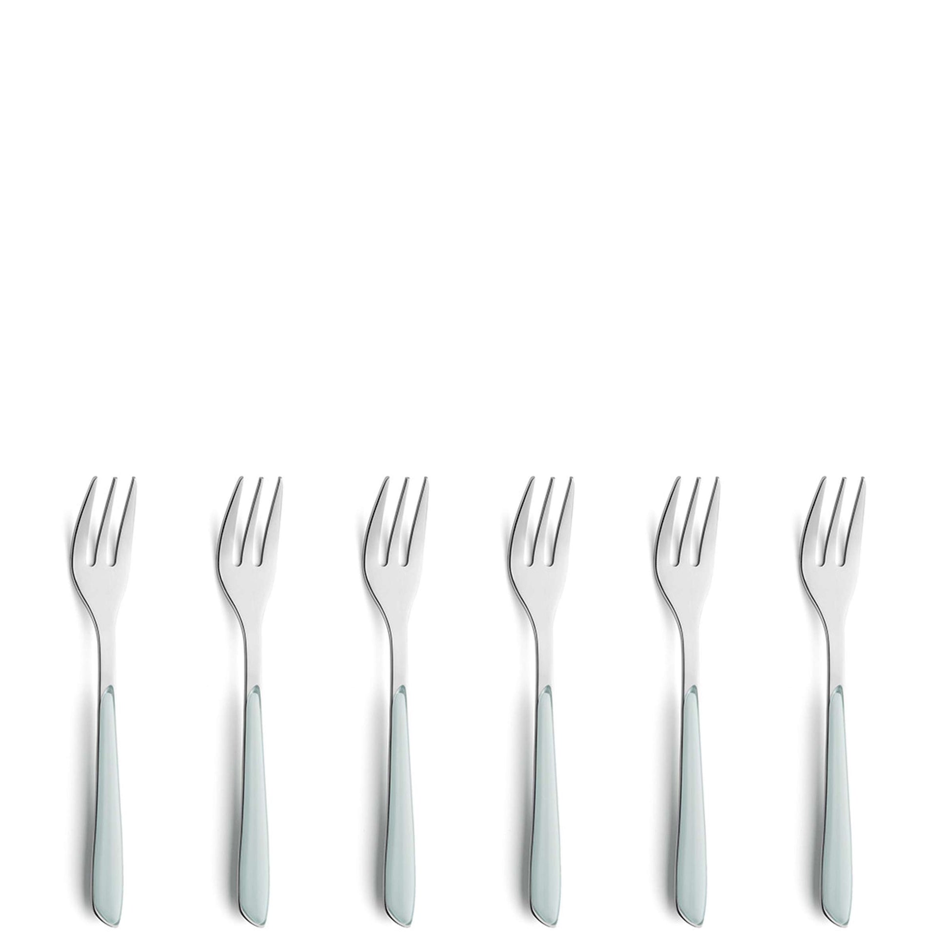 Mit dem PRISMA Kuchengabel Set 6-teilig mint bringst du frische Farbakzente auf den Tisch. Die Edelstahlgabeln mit transparenten Griffen in Mint liegen angenehm in der Hand und sind perfekt für Kuchen, Desserts oder Torten geeignet.