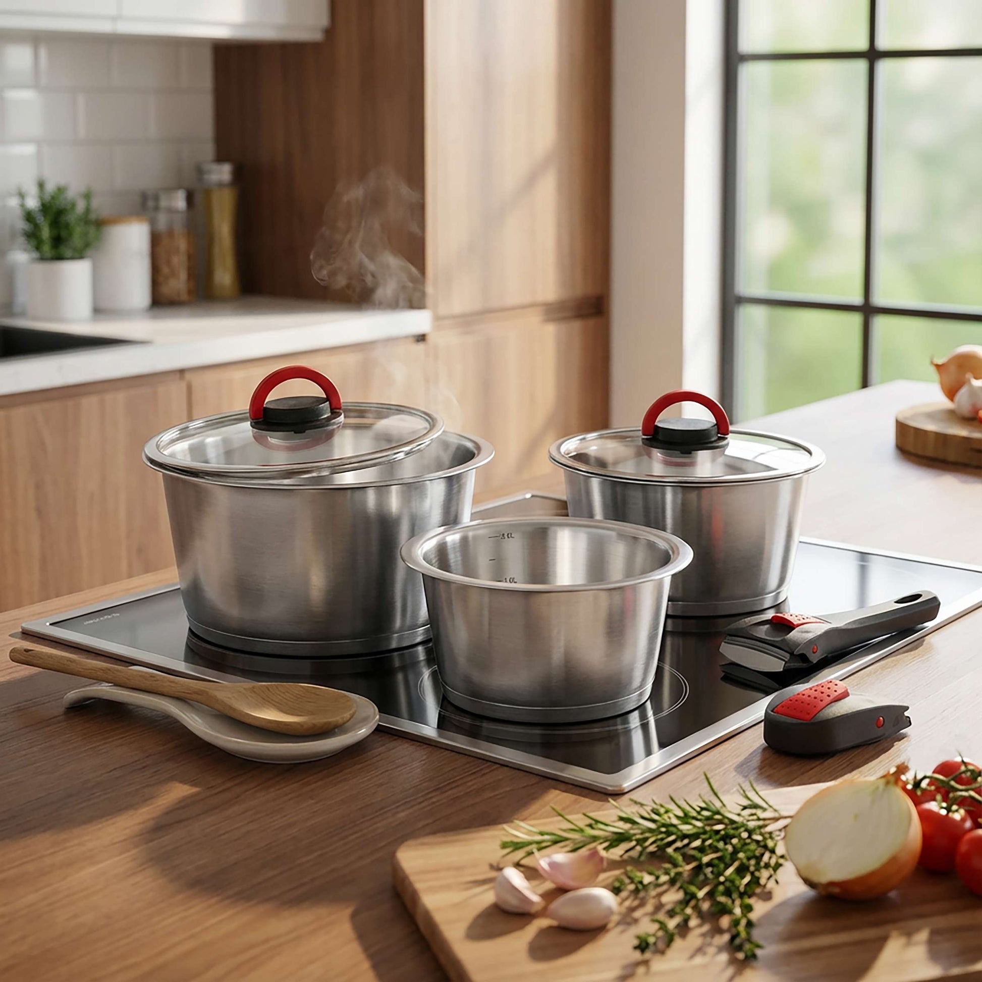 - 3 Kochtöpfe Ø 16, 18, 20 cm (1,5, 2, 3 L) cm), 3 Topf- und Frischhaltedeckel, 3 Griffe