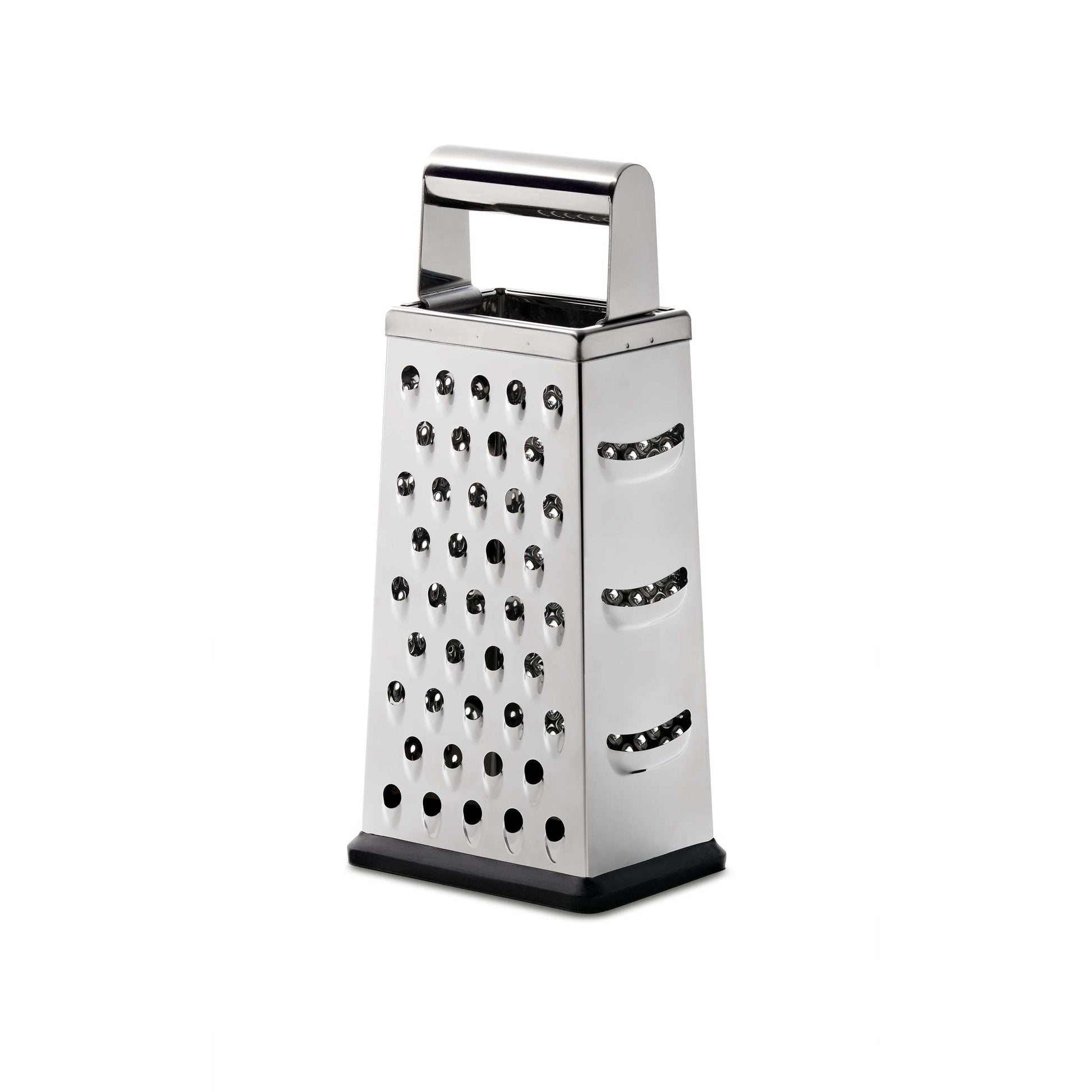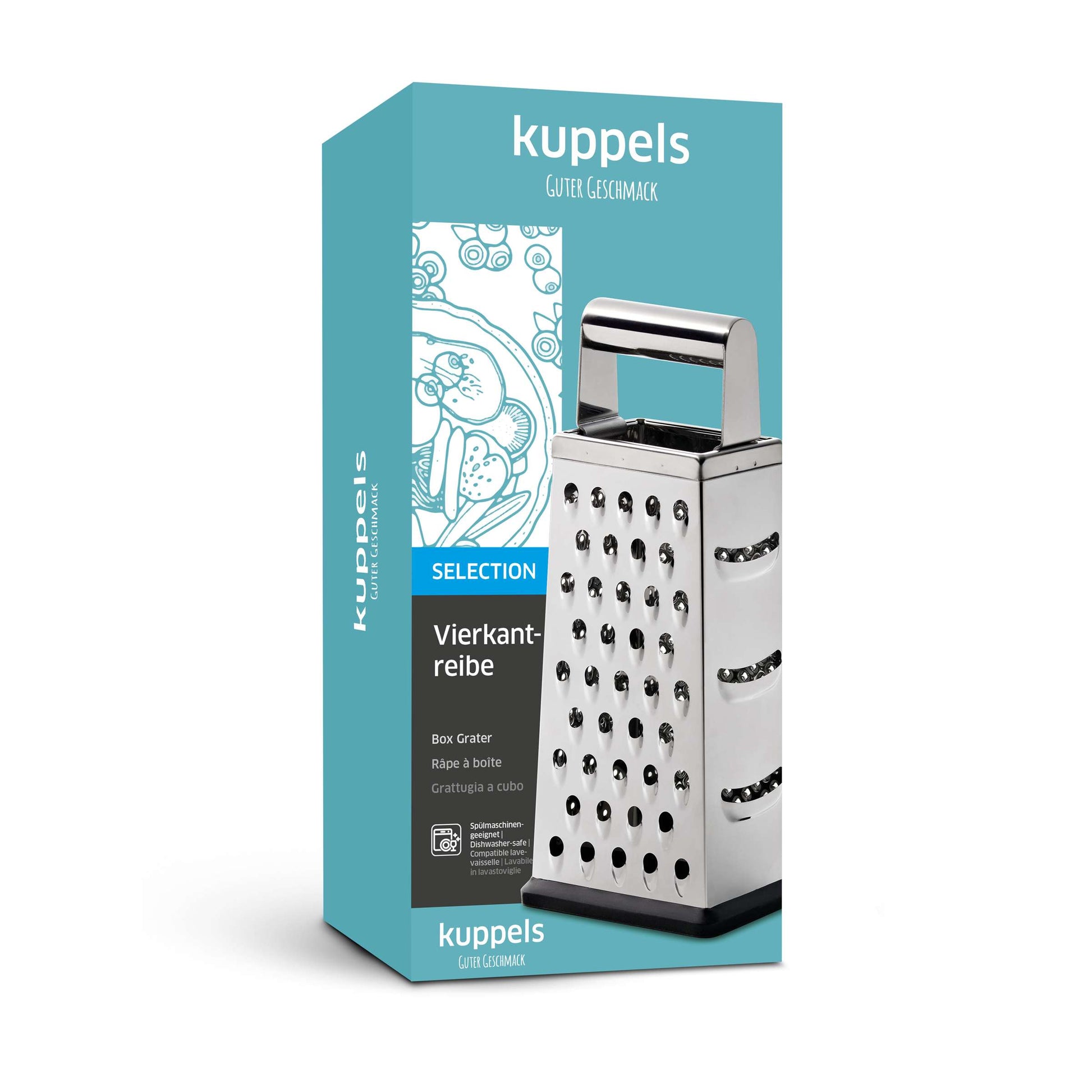 Ob feine Parmesanraspeln für Pasta, gehobelte Karotten für einen frischen Salat oder fein geschnittene Zucchini für ein Gemüsegericht – mit der Edelstahl-Vierkantreibe von Kuppels gelingen dir alle Zubereitungsschritte mühelos. Dank ihrer vier extra-scharfen Funktionsflächen kannst du raspeln, hobeln, schneiden und reiben – und hast so für jede Küchenidee das passende Werkzeug zur Hand. Hergestellt aus rostfreiem Edelstahl, der besonders langlebig, hygienisch und pflegeleicht ist. Mit rutschfestem Boden, stabilen Stand und Edelstahlgriff.
