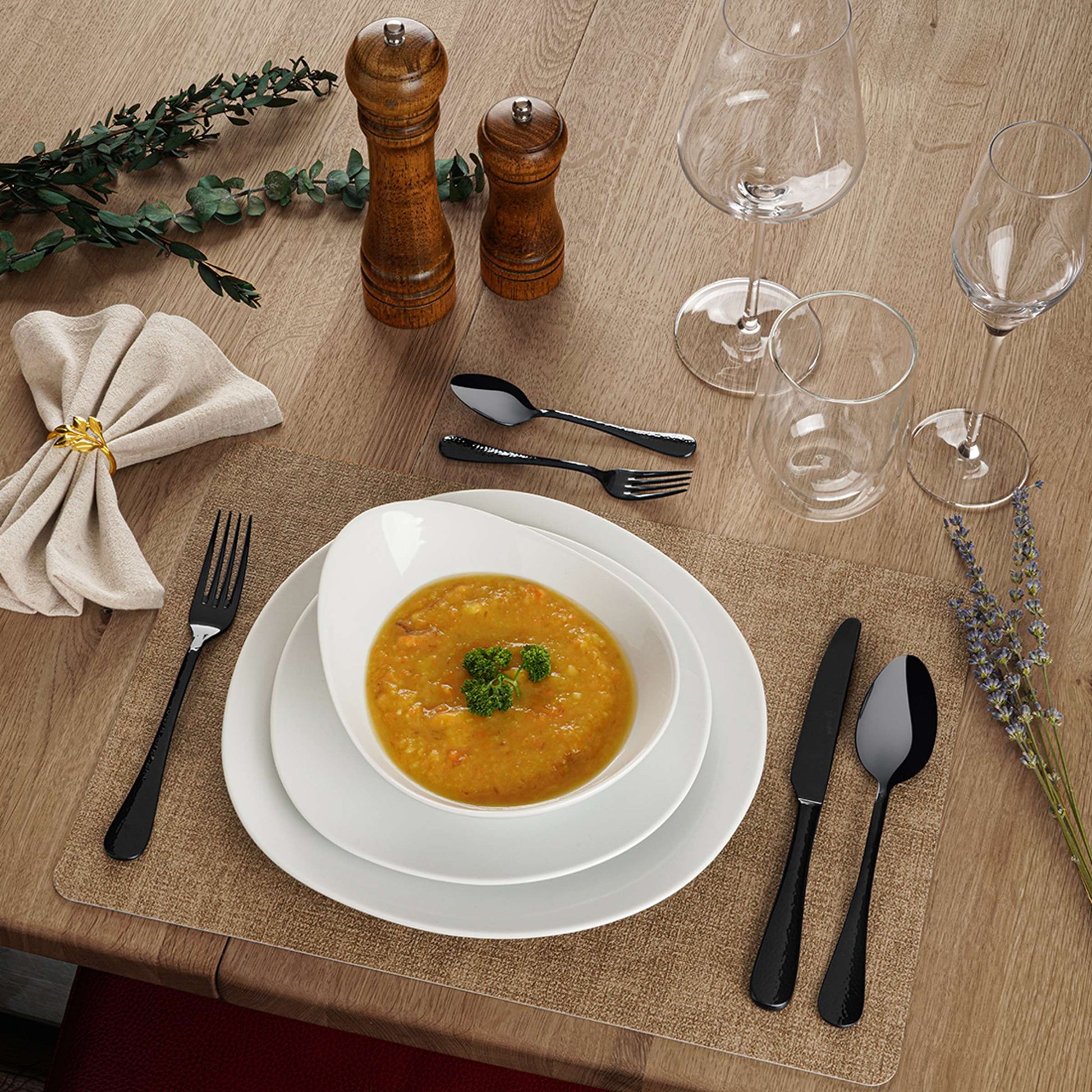 Das Besteckset Mondo im eleganten Hammerschlag-Design mit PVD-Veredelung in schwarz vereint außergewöhnlichen Stil mit harmonisch anspruchsvollem Charme. Die glänzende Oberfläche und die elegant gehämmerten Griffe der Besteckserie Mondo schaffen eine moderne und ansprechende Symbiose. Optisch und haptisch perfekt ausbalanciert, besticht dieses Besteck durch klare Konturen und anmutige Proportionen.