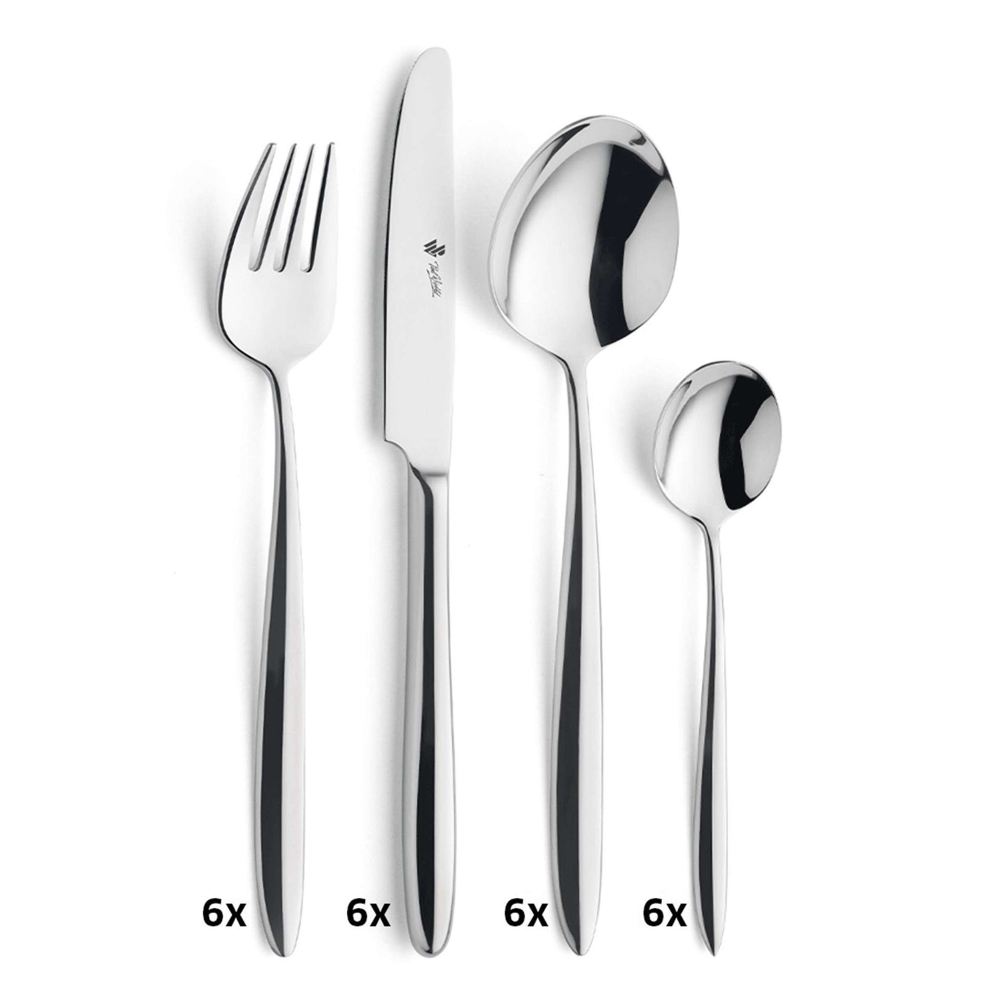 - Inhalt: 6 Kaffeelöffel, 6 Menügabeln, 6 Menülöffel, 6 Menümesser
