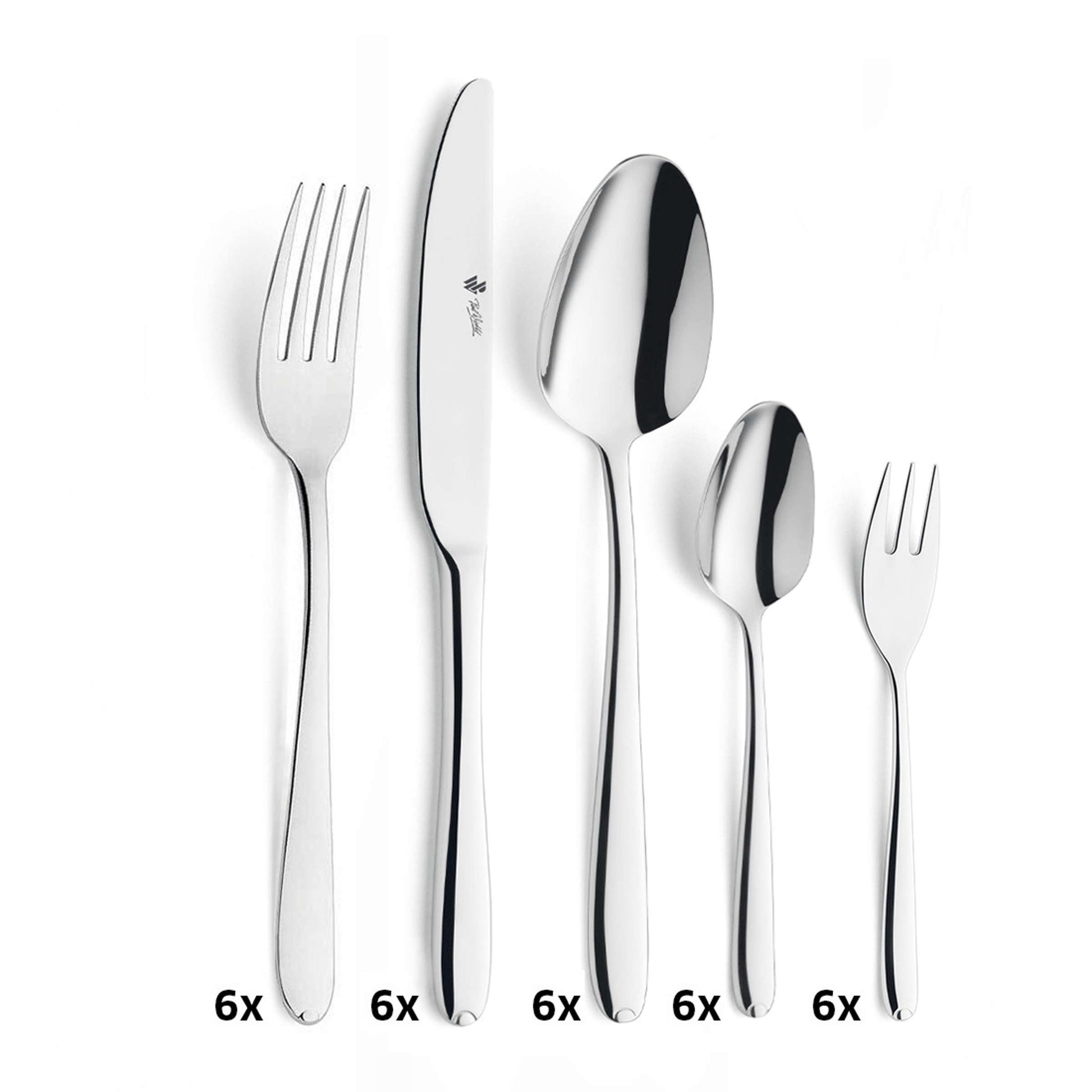 - Inhalt: 6 Kaffeelöffel, 6 Kuchengabeln, 6 Menügabeln, 6 Menülöffel, 6 Menümesser