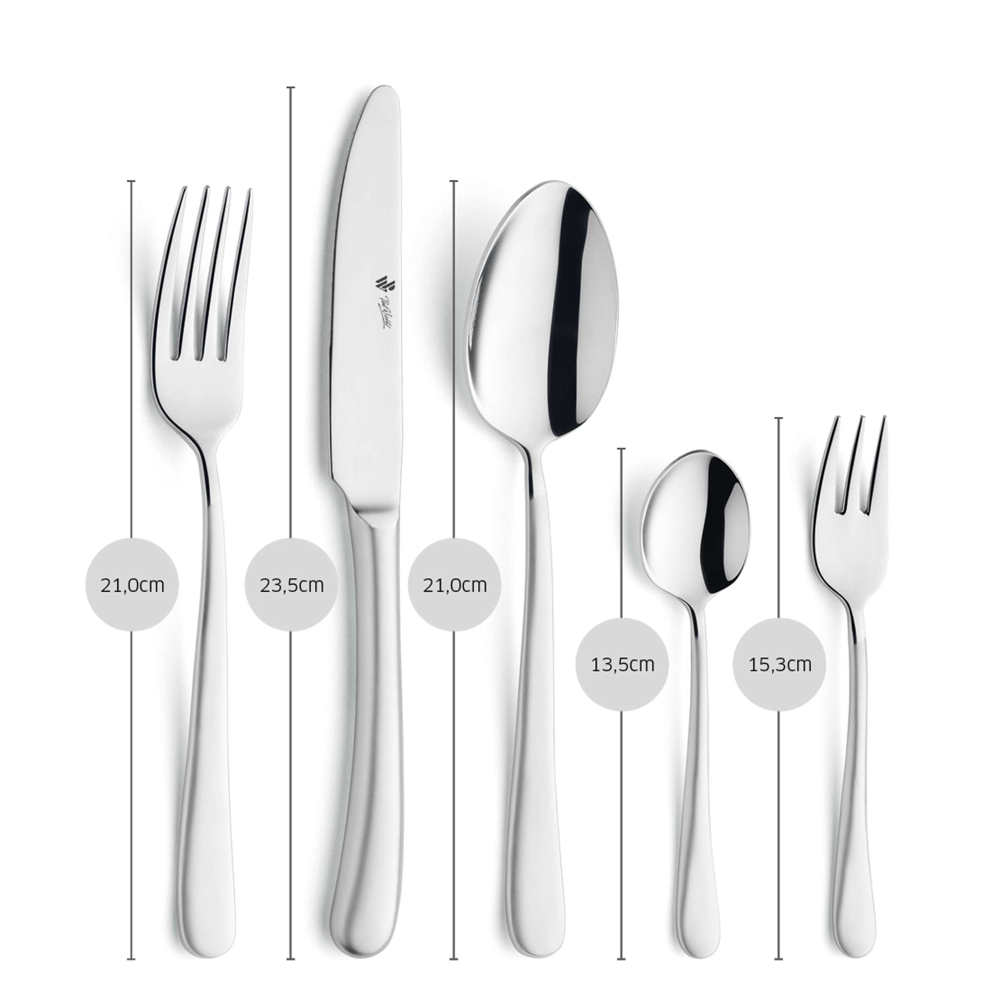 - Inhalt: 12 Kaffeelöffel, 12 Kuchengabeln, 12 Menügabeln, 12 Menülöffel, 12 Menümesser