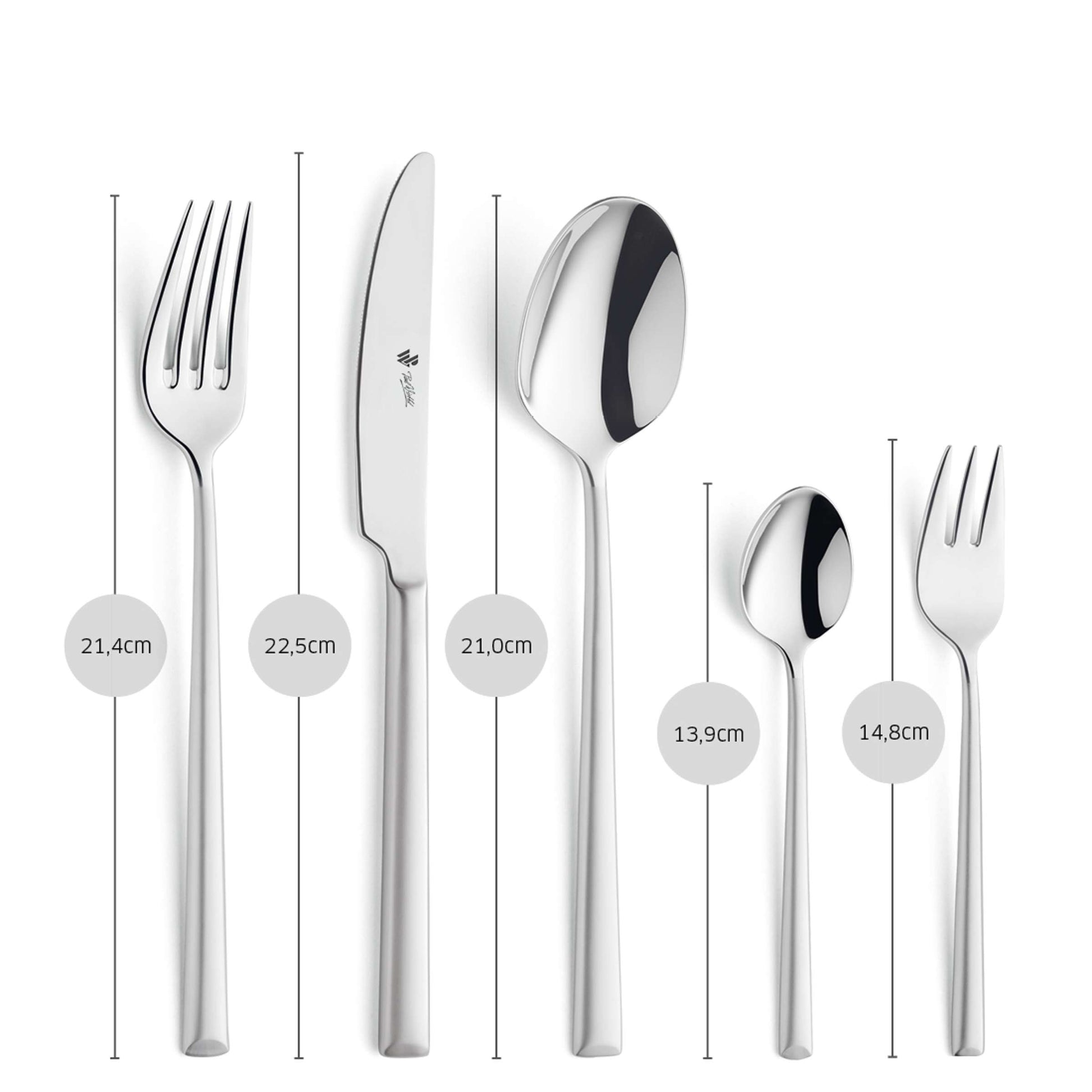 - Inhalt: 1 Sahnelöffel, 1 Saucenlöffel, 1 Tortenheber, 1 Zuckerlöffel, 12 Kaffeelöffel, 12 Kuchengabeln, 12 Menügabeln, 12 Menülöffel, 12 Menümesser, 2 Fleischgabeln, 2 Servierlöffel