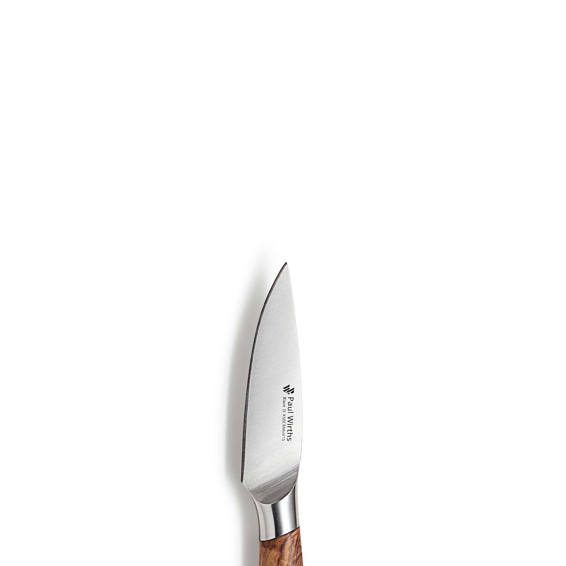 Das Schälmesser der Messerserie Blaze, gleitet mit seiner extremscharfen Klinge mühelos durch verschiedenste Obst und Gemüsesorten - präzises Schälen und Schneiden wird mit diesem Messer zur reinen Freude. Die Qualität der Klinge garantiert nicht nur Schärfe, sondern auch eine außergewöhnliche Langlebigkeit. Blaze setzt neue Maßstäbe in puncto Design und Funktionalität.Der Griff besteht aus feinstem Olivenholzund verleiht dem Messer nicht nur einen Hauch von Luxus, sondern auch eine hervorragende Haptik. Olivenholz ist für seine Widerstandsfähigkeit und seine edle, dunkle Färbung bekannt, die das schlichte und gleichzeitig elegante Design des Messers unterstreicht.Dank der perfekten Balance aus Klinge und Griff eignet sich dieses Kochmesser sowohl für Profis als auch für ambitionierte Hobbyköche. Das Messer besticht durch seine Schlichtheit und gleichzeitig beeindruckende Eleganz – ein wahres Schmuckstück in jeder Küche.