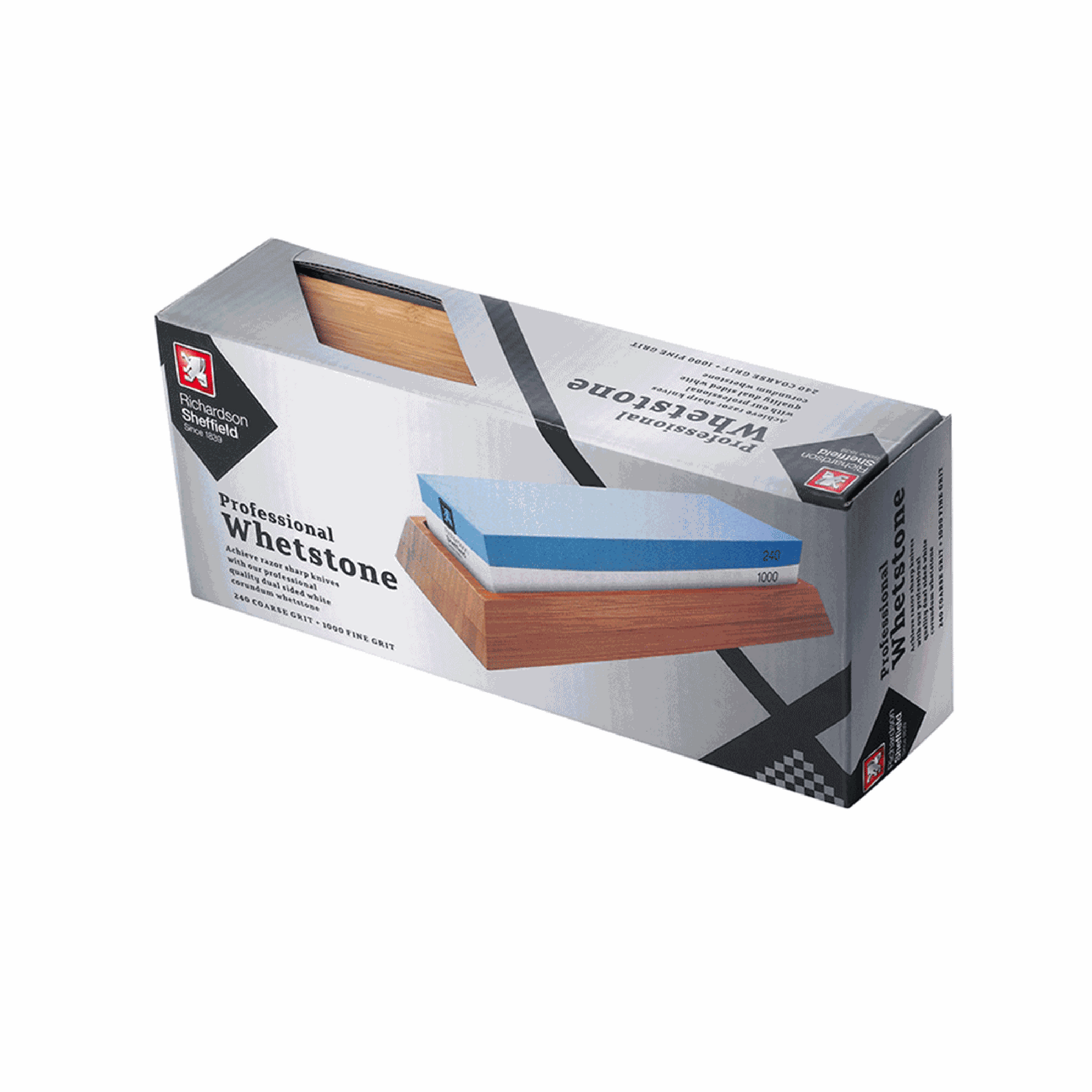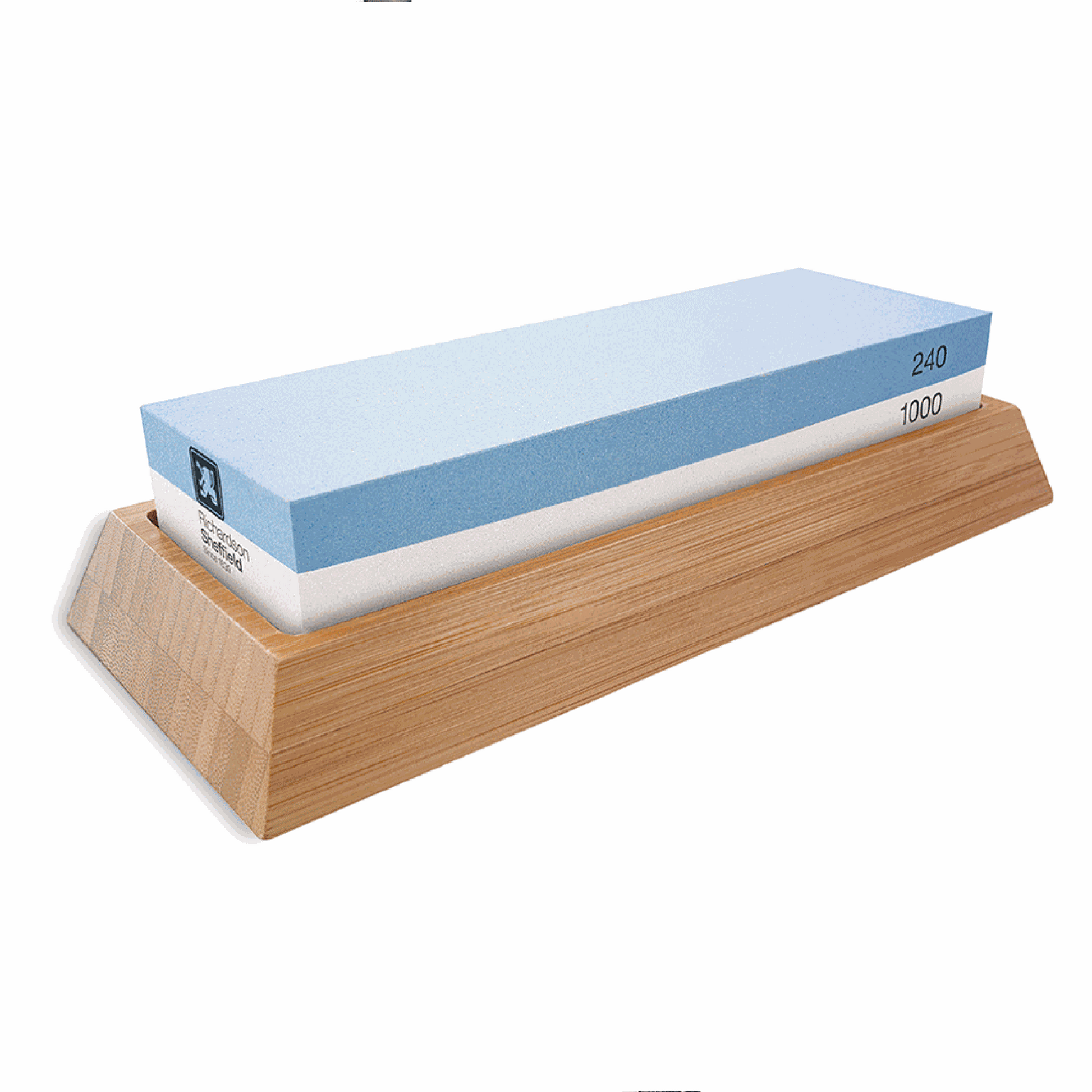 Dank seiner besonderen Eigenschaften schärft dieser Schleifstein Küchenmesser besonders effizient. Zum einen, weil er zwei unterschiedliche besitzt. Die blaue Seite (240er Körnung) dient der Wiederherstellung stumpfer oder beschädigter Messer und die feine, weiße Seite mit 1000er Körnung stellt den perfekten Schärfeschliff wieder her. Vor seiner Benutzung 5 Minuten in lauwarmes Wasser gelegt werden. In Kombination mit Wasser bilden kleinste Korundpartikel eine Schleifpaste wodurch außergewöhnliche Schärfeergebnisse erzielt werden.