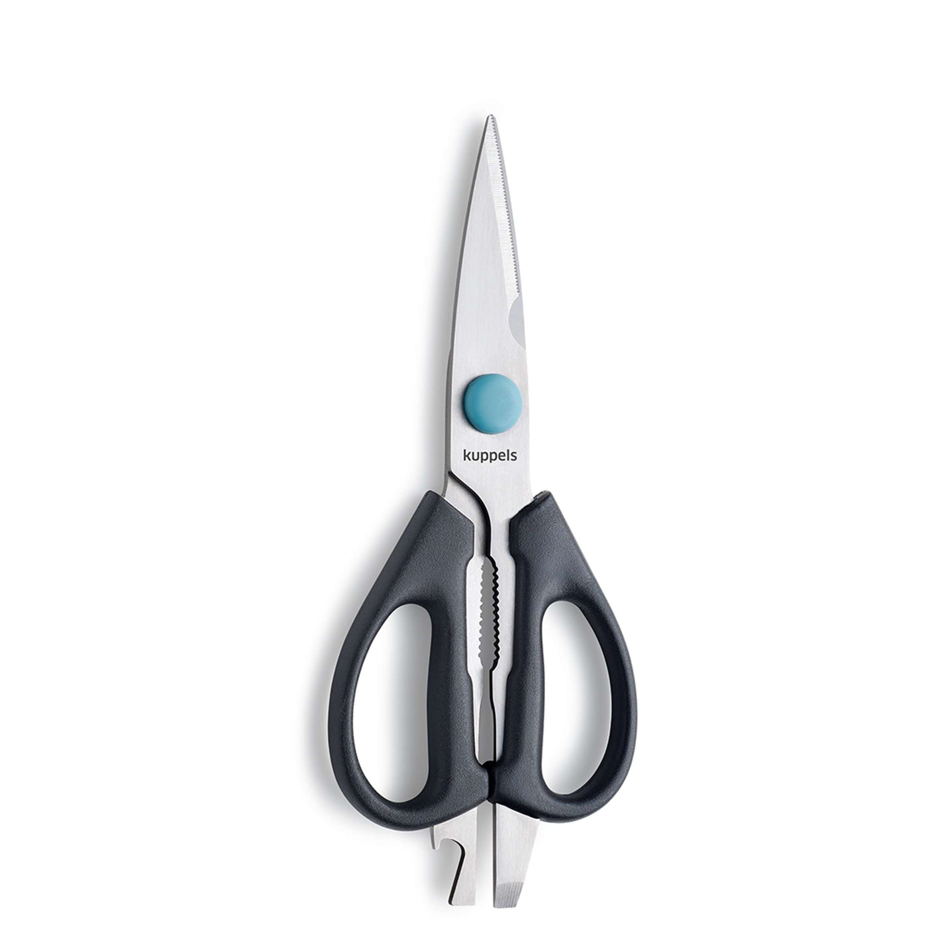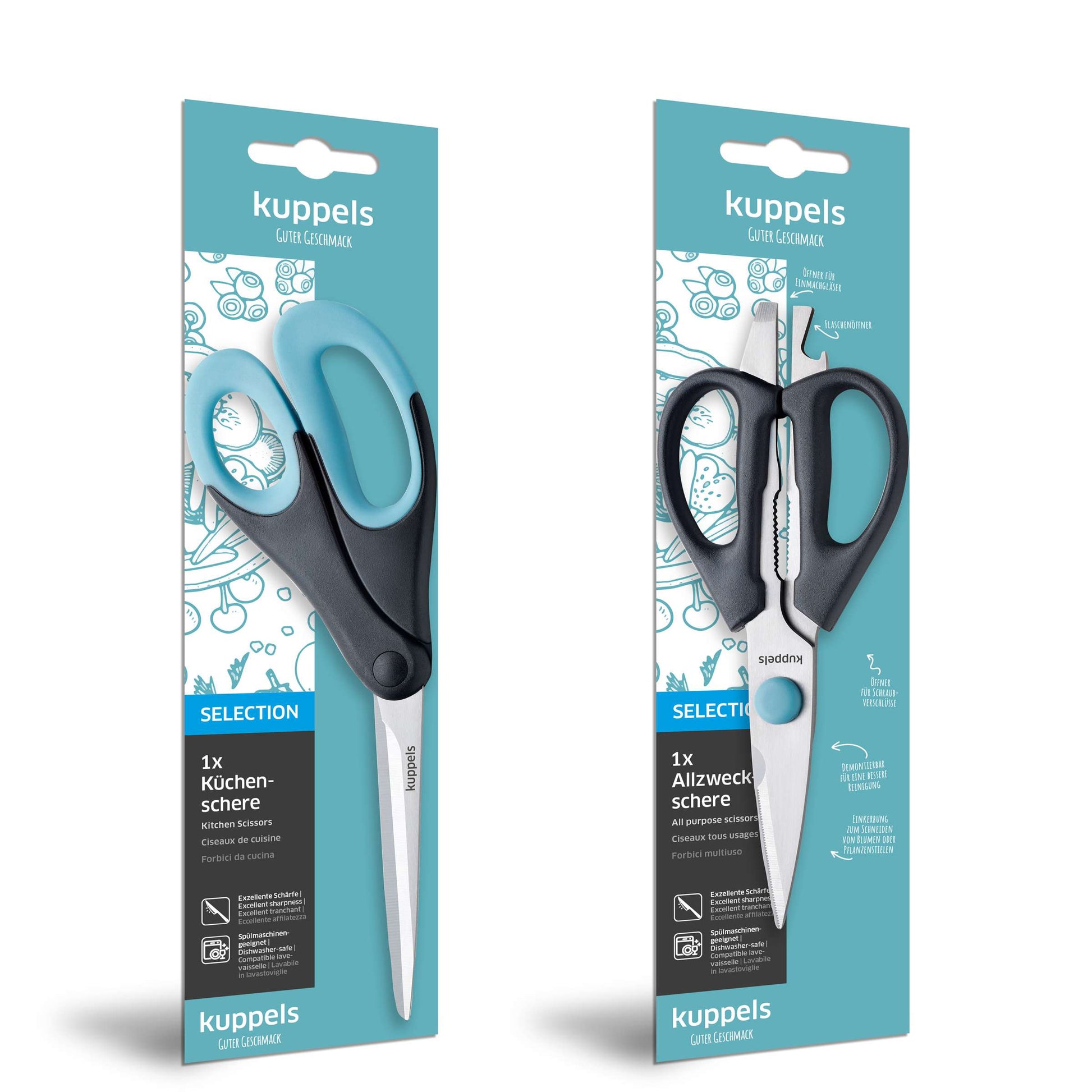 Kuppels Küchenscheren Set – Präzision und Vielseitigkeit für Deine Küche. Entdecke das praktische Kuppels Küchenscheren Set, bestehend aus einer robusten Universal-Küchenschere und einer handlichen Allzweckschere. Die große Universalschere eignet sich perfekt zum Schneiden von Papier, Verpackungen oder Tüten. Die kleinere Allzweck-Küchenschere von Kuppels ist ideal für das Schneiden von Kräutern und Blumen und hat besondere Zusatzfunktionen, wie beispielsweise den Flaschen- und Schraubverschlussöffner. Beide Scheren liegen angenehm in der Hand und schneiden sauber ohne zu quetschen oder zu klemmen. Ganz unkompliziert, ganz praktisch.