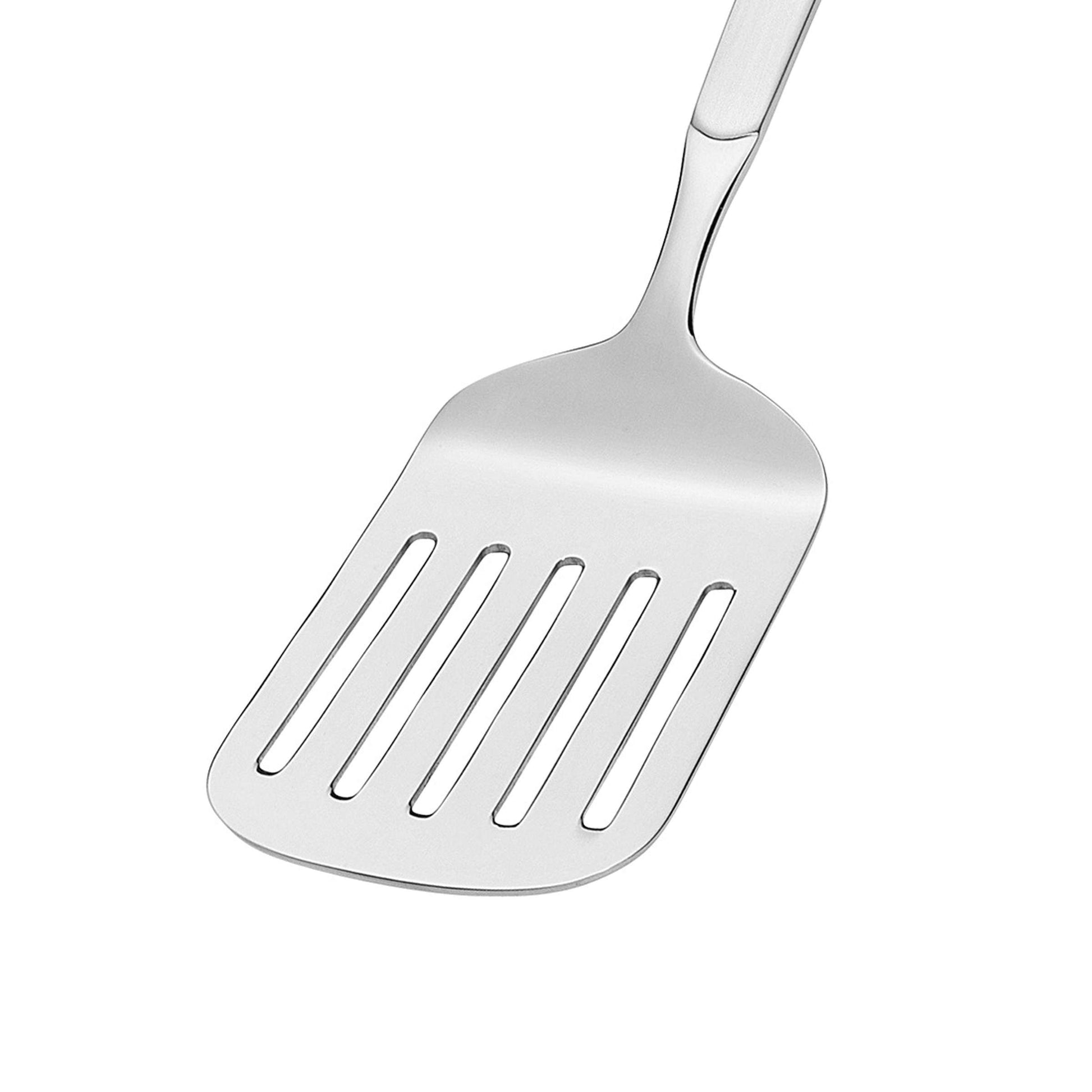 Der Buffet Wender/Heber ist ein unverzichtbares Werkzeug für den Einsatz in professionellen Gastronomiebetrieben, besonders bei Buffets und Servierstationen. Durch seine robuste, funktionale Form eignet er sich ideal zum Anheben und Wenden von Speisen, sei es direkt am Buffet oder in der Küche. Hergestellt aus hochwertigem Edelstahl 18/10, bietet dieses Besteckteil nicht nur eine hervorragende Beständigkeit, sondern auch eine ansprechende Ästhetik. Der Griff ist mattiert und leicht abgesetzt, wodurch er besonders gut in der Hand liegt und für eine komfortable Handhabung sorgt. Mit seiner Kombination aus Funktionalität und elegantem Design ist der BUFFET Wender/Heber die perfekte Wahl für Gastronomen, die sowohl Effizienz als auch Stil in ihren Service integrieren möchten.